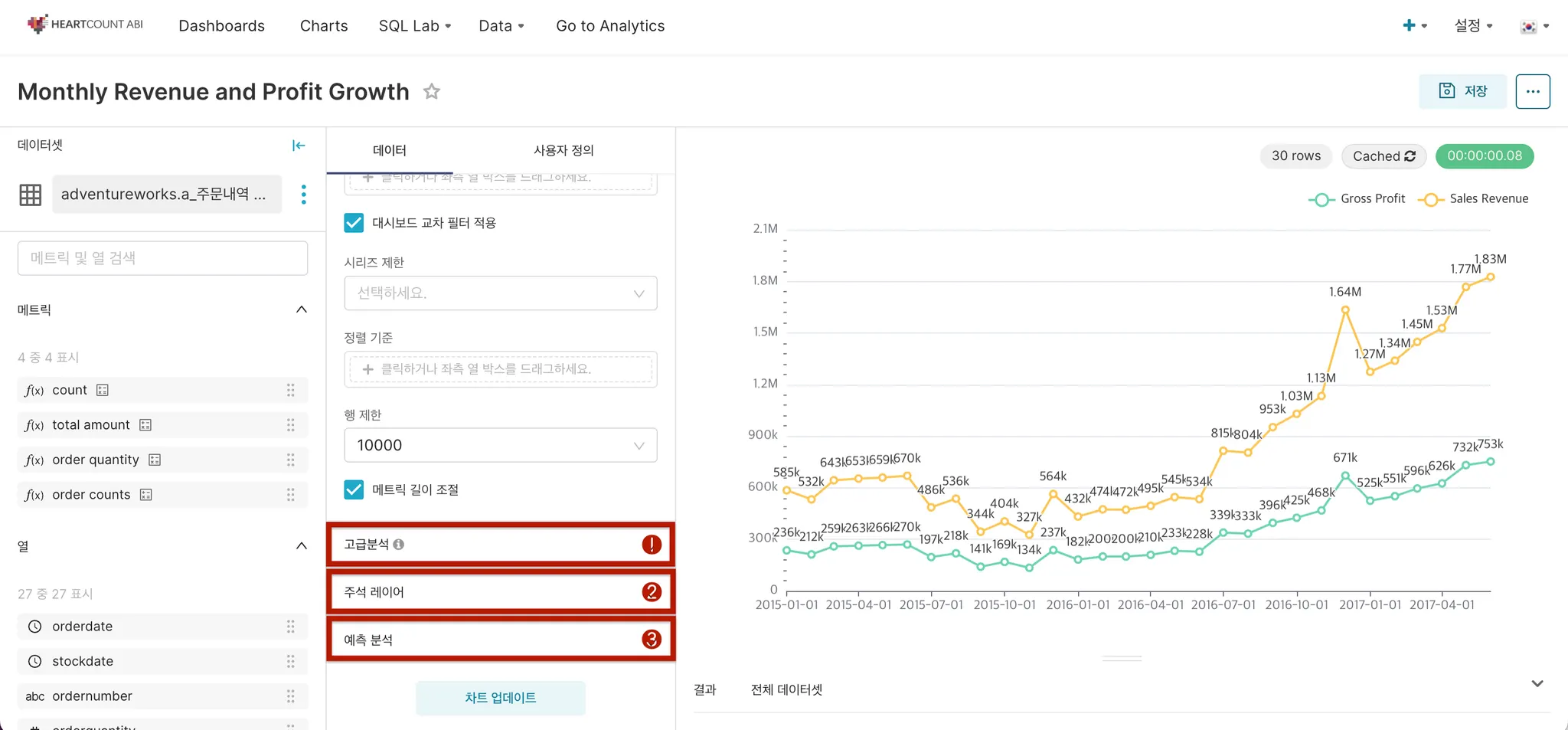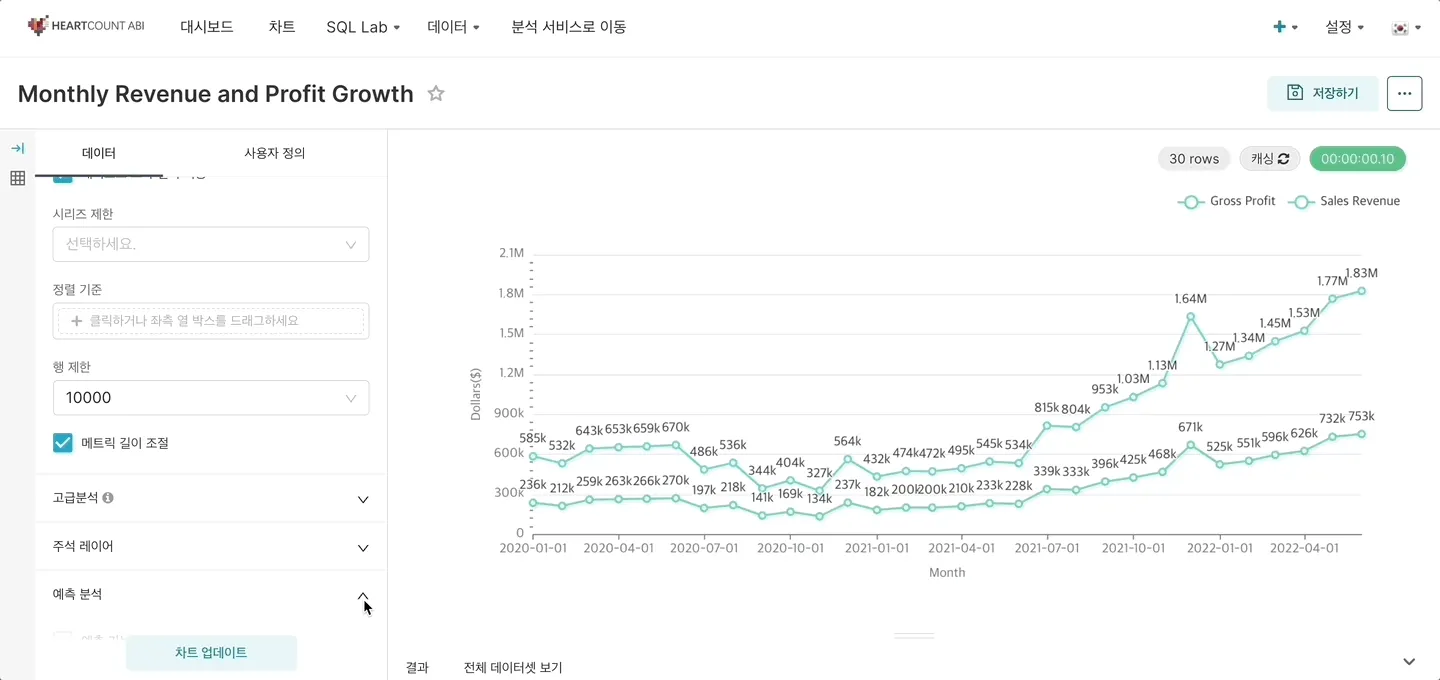 예측 기능 사용 체크박스를 선택하여 활성화시킨 후 차트를 업데이트해주면 표시됩니다.