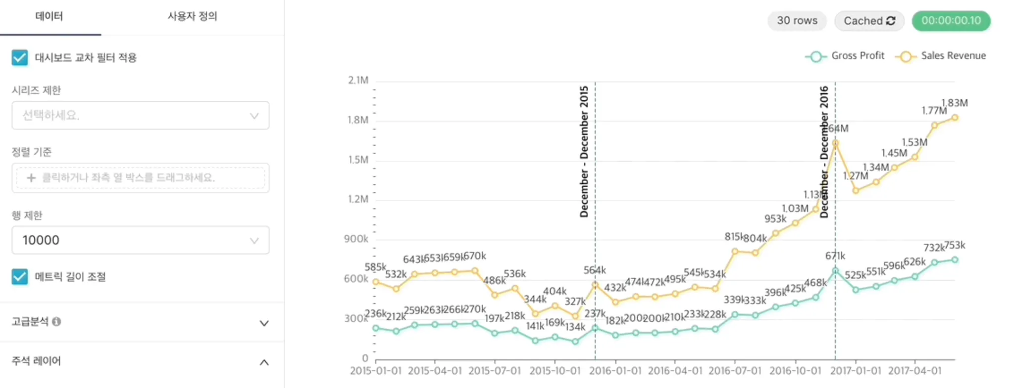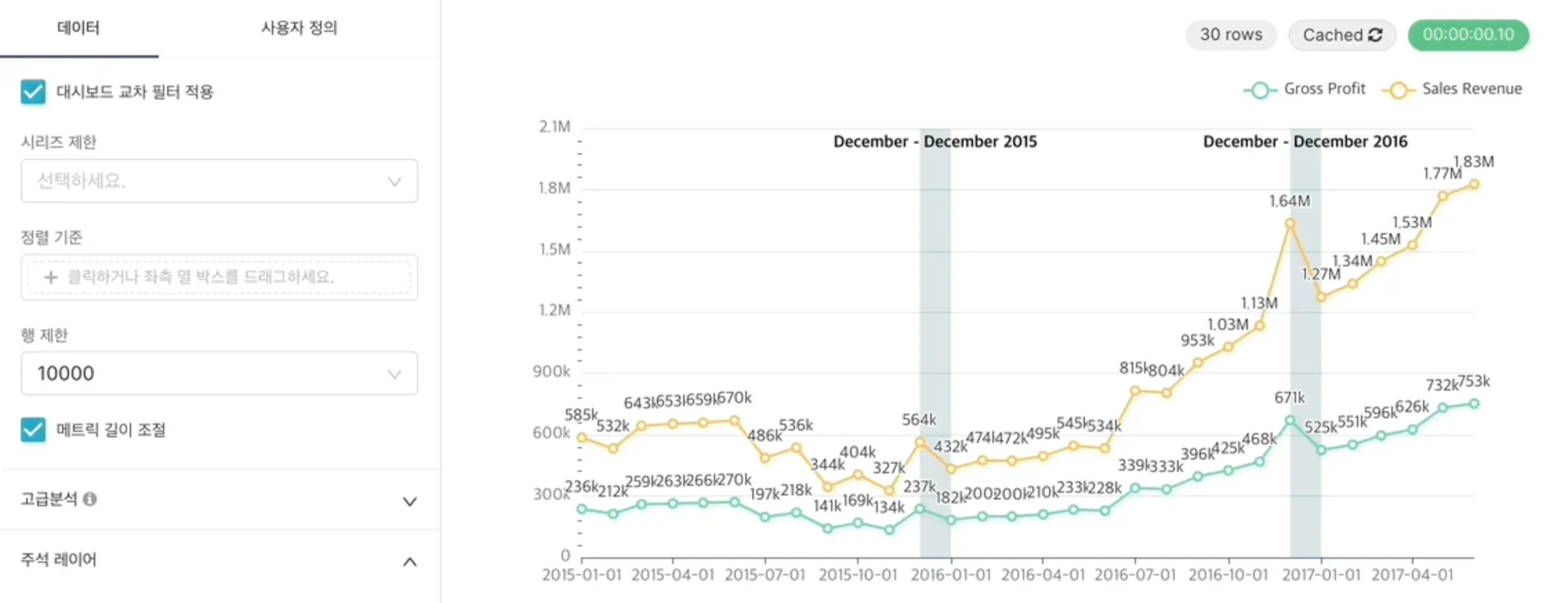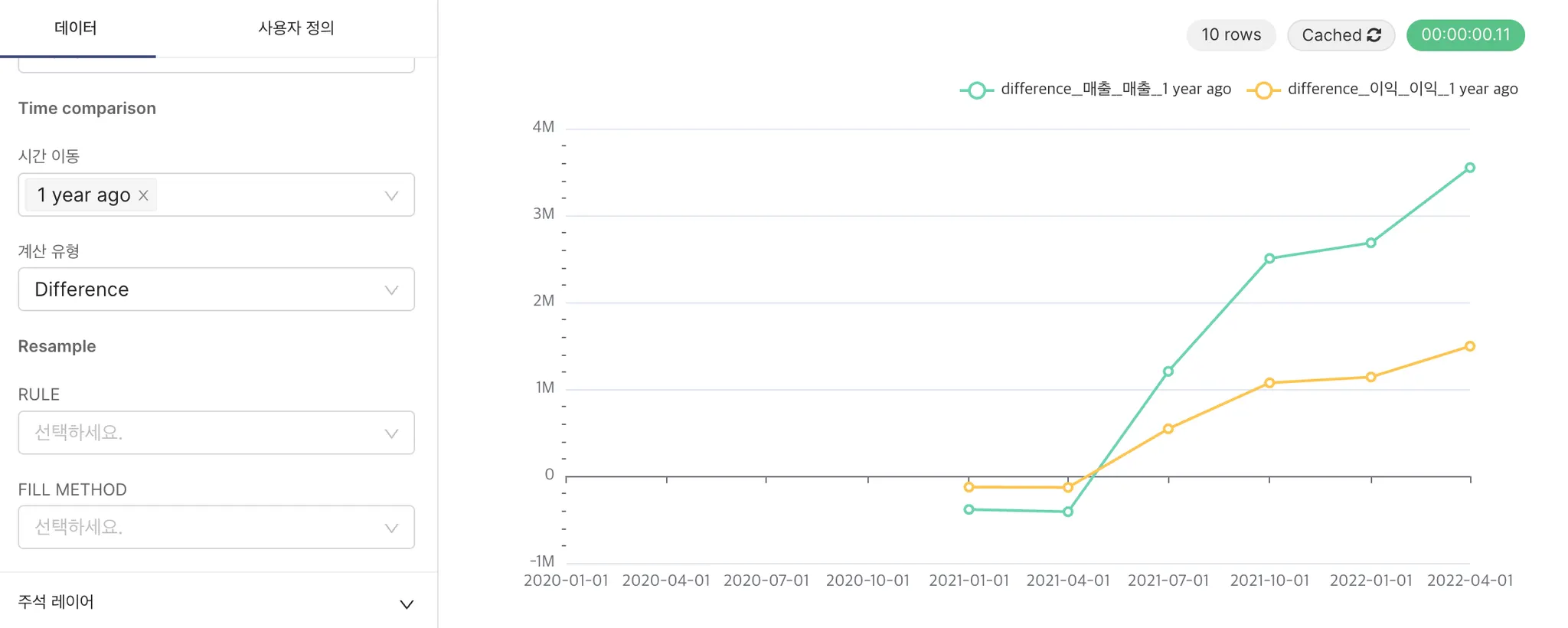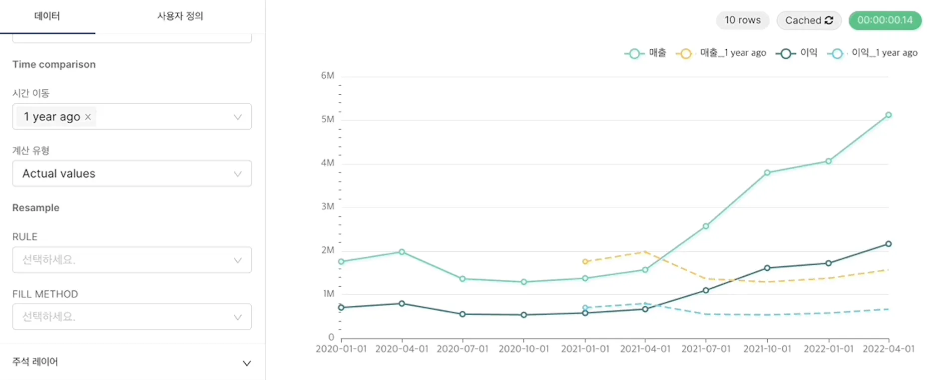 예를 들어 아래와 같이 1년 전 값을 차트에 함께 나타내어 비교하는 그래프를 그릴 수 있습니다.