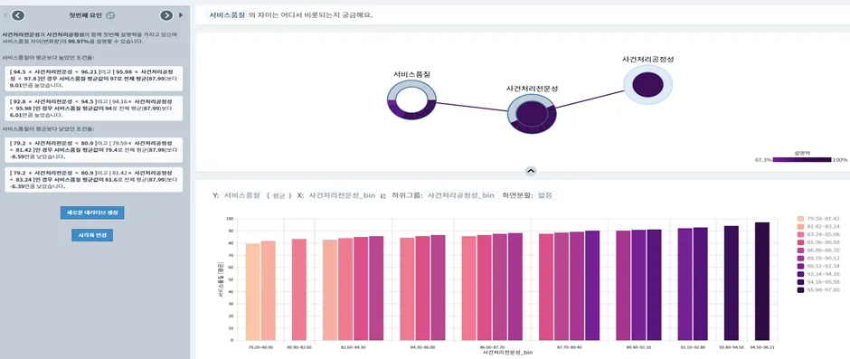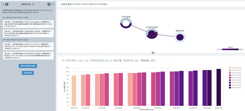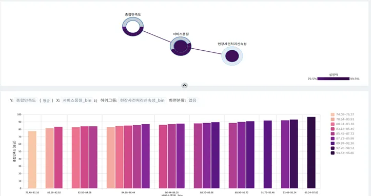→ [ 79.4 ≤ 서비스품질 < 81.16 ]이고 [ 74.09 ≤ 현장사건처리신속성 < 76.37 ]인 경우 종합만족도 평균값이 77.2로 전체 평균(87.22)보다 -10.02만큼 낮았습니다.