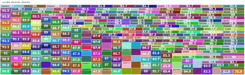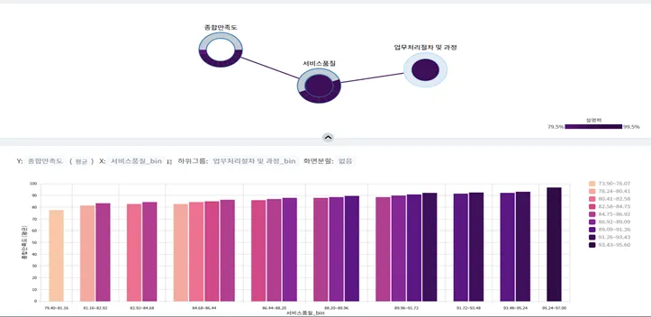 → [ 79.59 ≤ 사건처리공정성 < 81.42 ]이고 [ 77.2 ≤ 종합만족도 < 79.14 ]인 경우 서비스품질 평균값이 79.4로 전체 평균(87.99)보다 -8.59만큼 낮았습니다.