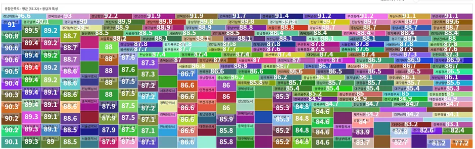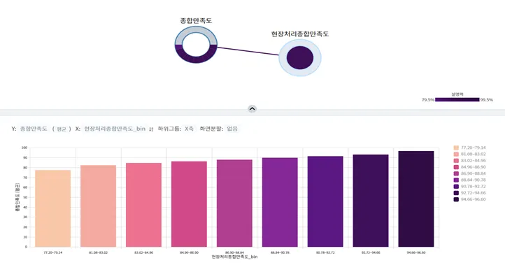 → [ 94.66 ≤ 현장처리종합만족도 < 96.6 ]인 경우 종합만족도 평균값이 96.6로 전체 평(87.22)보다 9.38만큼 높았습니다.