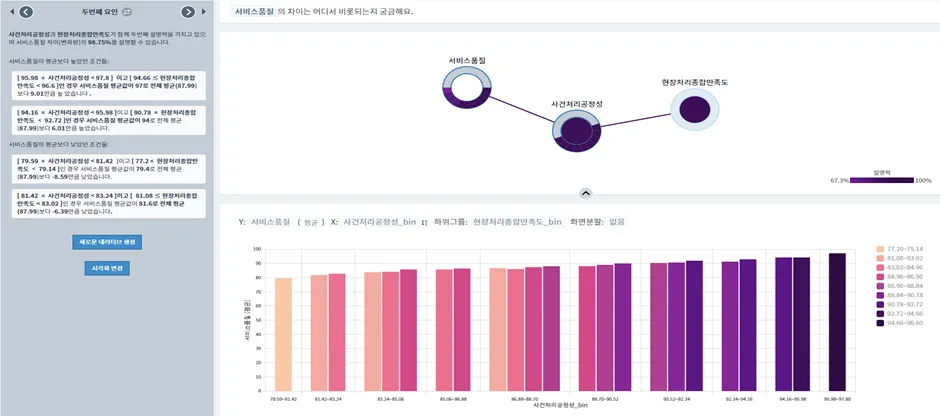 서비스품질과 업무처리절차 및 과정이 함께 두번째 설명력을 가지고 있으며 종합만족도 차이(변화량)의 98.63%를 설명할 수 있습니다.