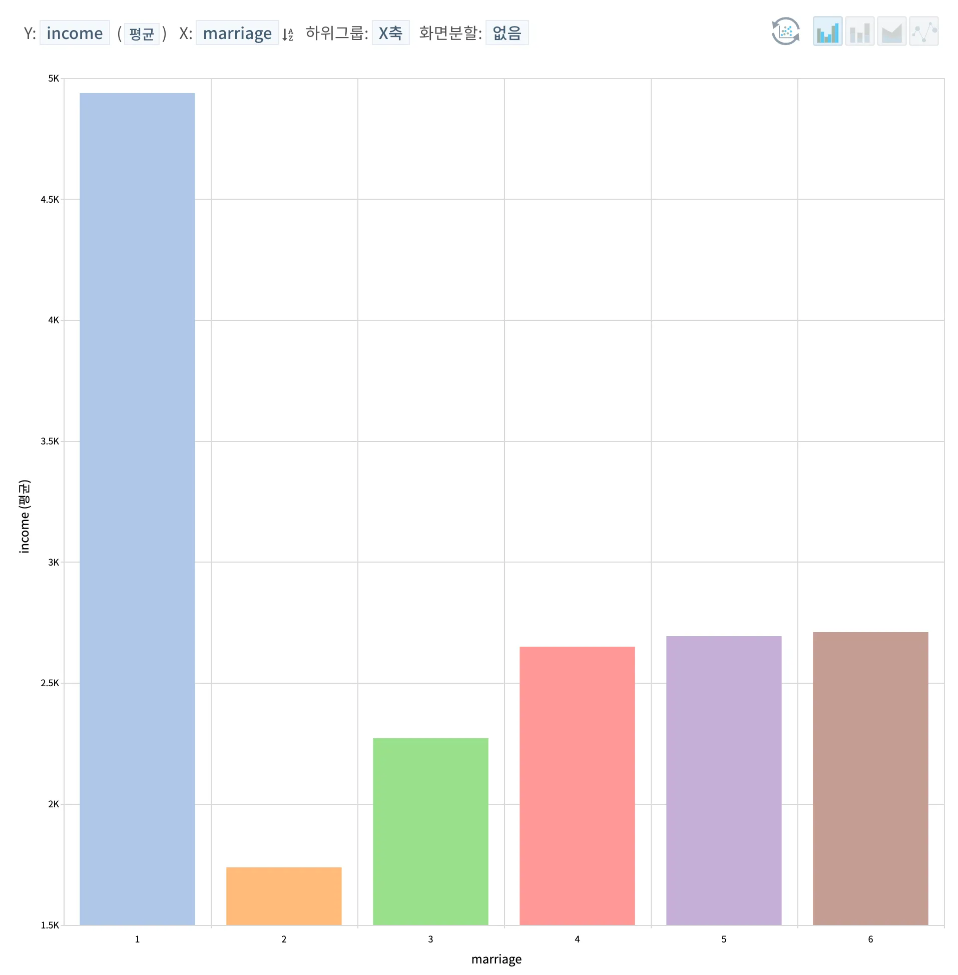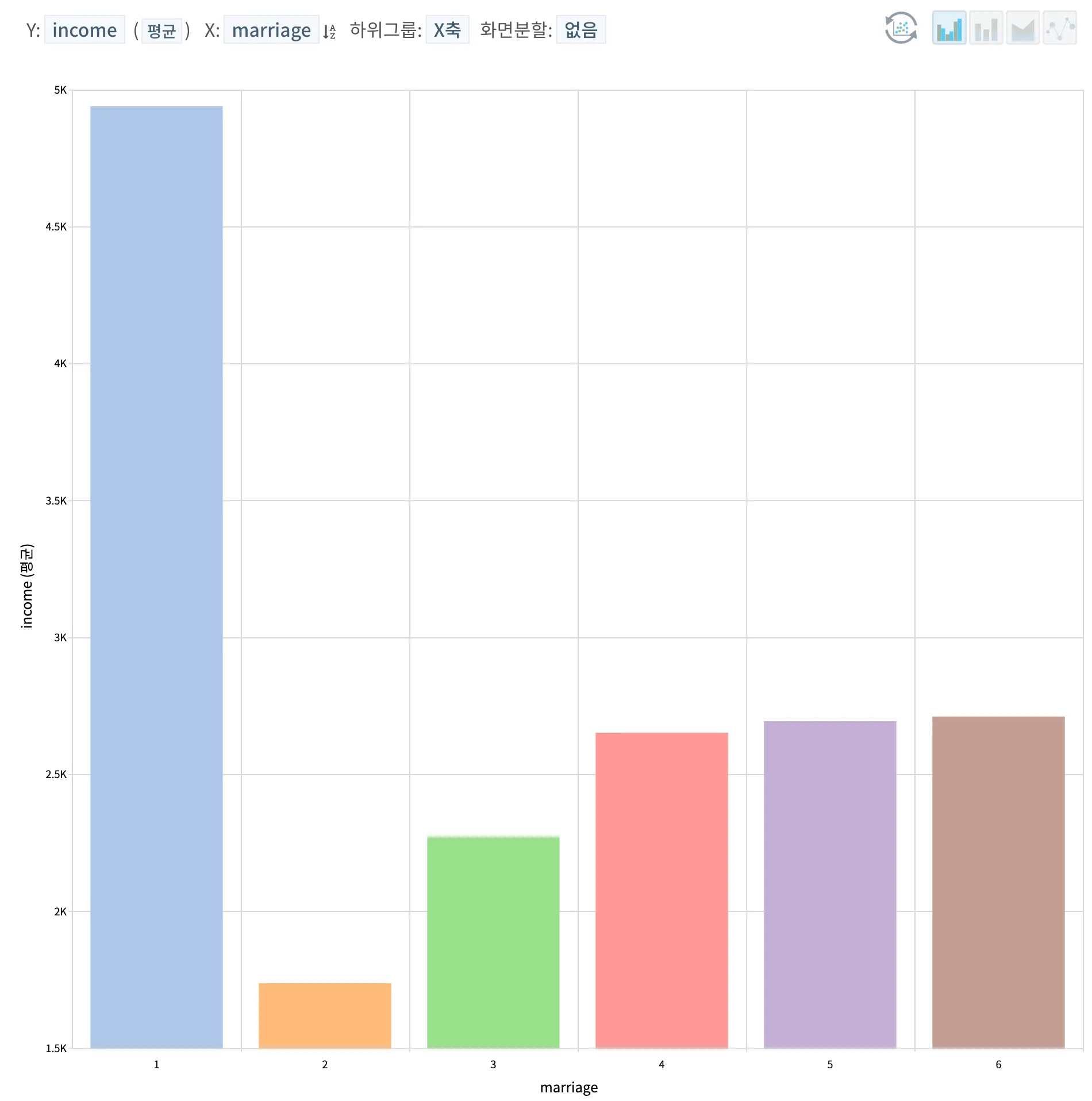 혼인여부에 따른 평균 연소득을 확인하고자하였으나, 조금 당황스러운 결과는 가장 높은 연소득을 보여주고 있는 1) 데이터의 경우 비해당으로 18세 미만으로 국내에서 현실적으로 18세 미만의 미성년자가 이와 같은 가장 높은 연소득을 갖고 있기에는 어려움이 있다. 추가적으로 2) 기혼의 경우에도 연소득이 가장 낮게 보여지는만큼 해당 데이터셋의 각 범주명의 설명자체가 잘못되었거나, 데이터셋의 수집에 문제가 있었던 것으로 판단된다. 하여, 혼인여부의 데이터를 갖고 추가적인 상관점을 분석하기에는 어려움이 있을 것으로 보여진다.