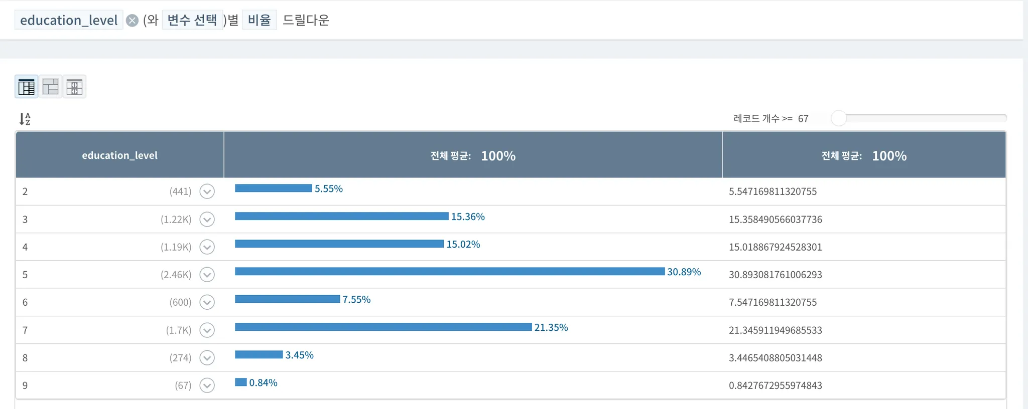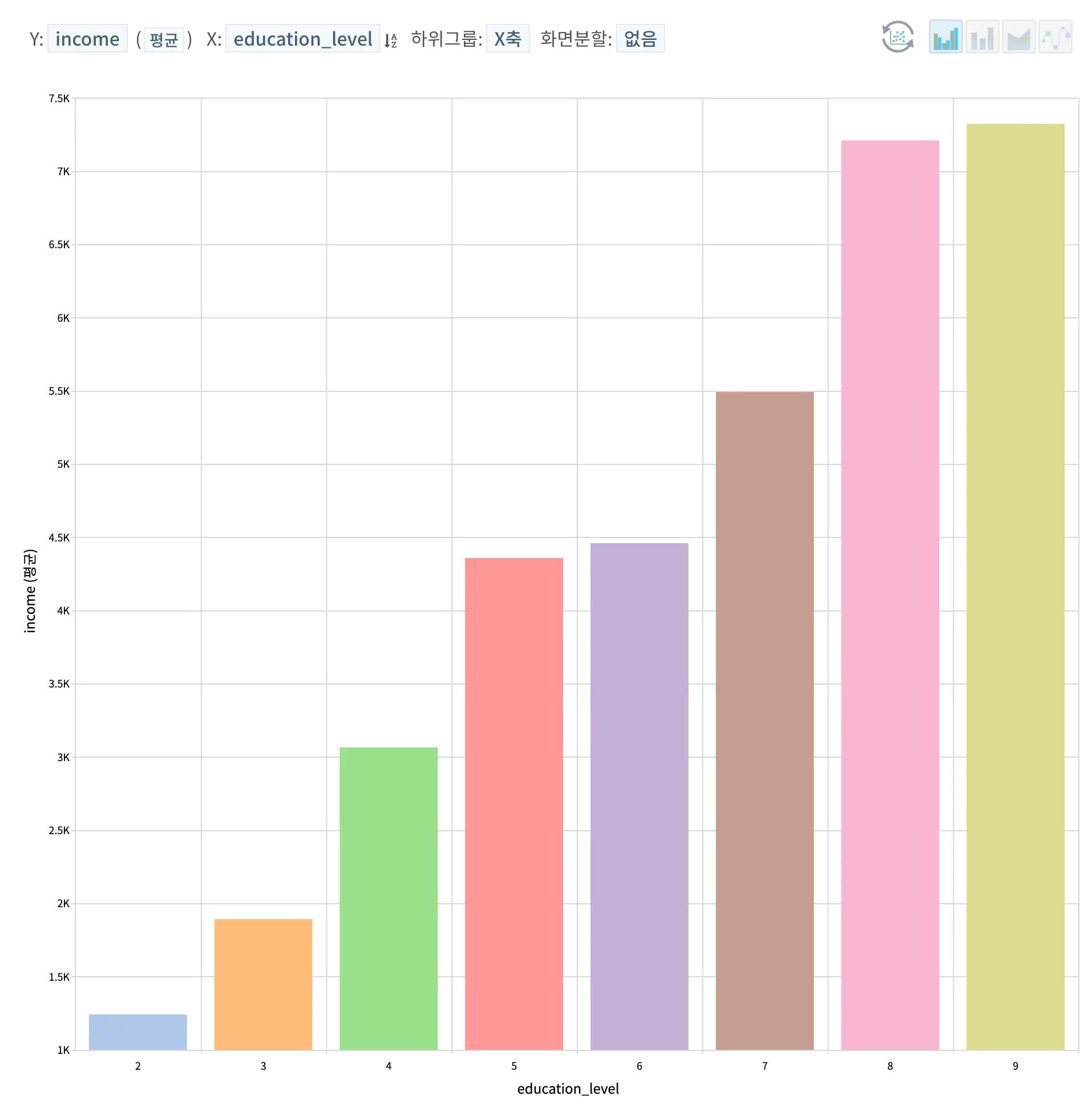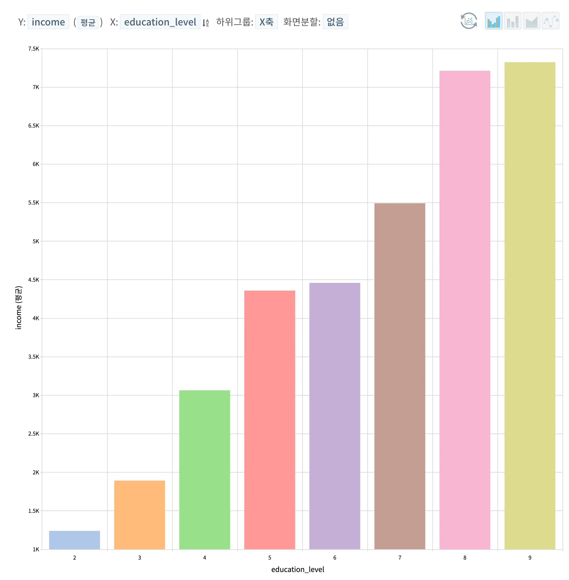 드릴다운을 통해 각 지역 내 교육수준에 따른 전체적인 분포를 확인한 결과, 90% 이상의 표본은 서울에 거주하는 것으로 확인되었다. 이에 따라 상단에서 확인한 지역별 평균 연소득의 시각화 결과는 서울 지역에 90% 이상 편향된 표본집단을 통해 분석된 만큼 지역별 정확한 평균 연소득 금액이라고 보기에는 힘들 것으로 판단되며, 지역별 데이터로 다른 변수들과의 상관관계를 보는 것은 어려울 것으로 판단된다.