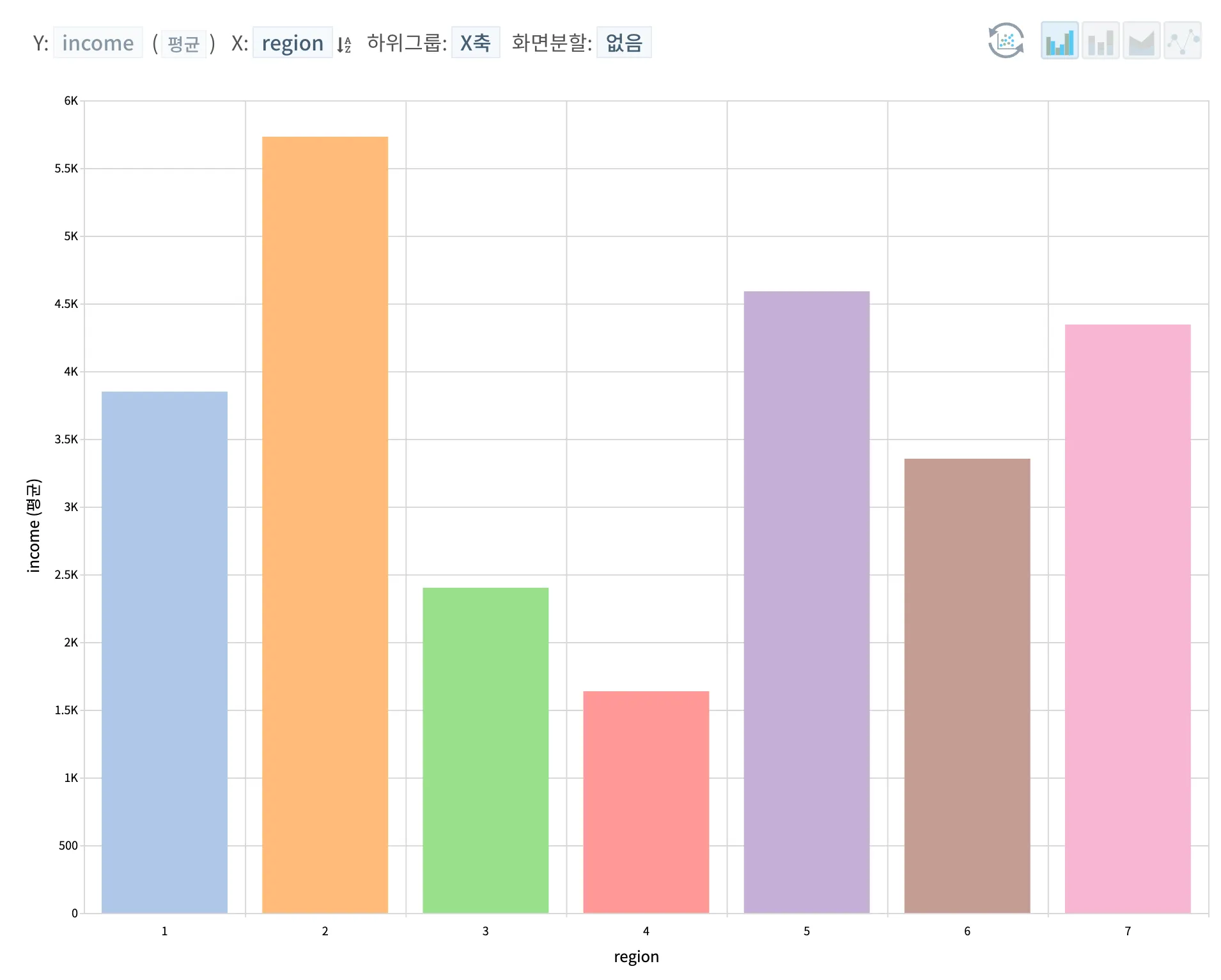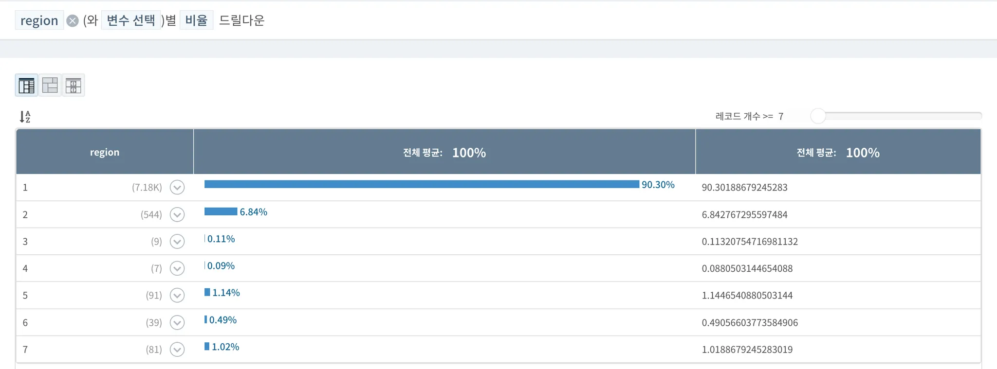 지역에 따른 평균 연소득을 보았을 때, 서울과 경기 지역의 연소득이 가장 높을 것이라고 예상하였으나, 2) 경기도 지역이 1위, 5) 충청남도가 2위, 7) 전라도&전주 지역이 3위, 그 다음이 1) 서울 지역으로 보여지고 있다. 의외의 결과로 보여지기에 혹시 데이터가 편향된 것이 아닌지 확인하고자 드릴다운으로 들어가보았다.