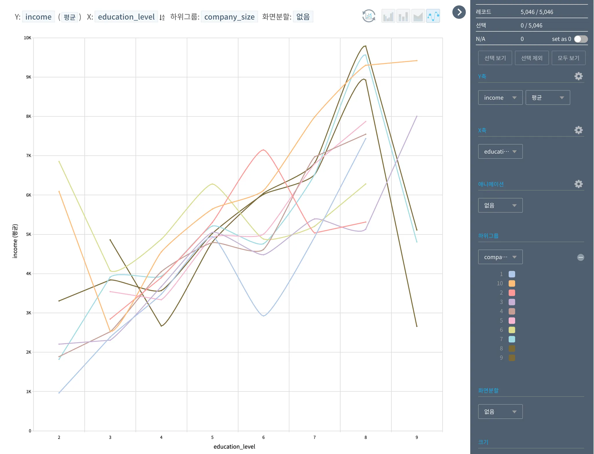 추가로, 상기 추가로 확인한 연령대와 상관없이 교육 수준에 따른 연소득을 각 근무하는 회사 사이즈에 따라 추가로 구분해보았고, 교육 수준 및 회사 사이즈에 따라 평균 연소득 역시 차이가 날 것이라 예상했던 것처럼 교육수준이 7) 4년제 이상 대학을 졸업자의 경우 회사 규모가 작을 수록 (1~3) 연 소득도 낮으며, 회사 사이즈가 커질 수록 연소득이 높은 것으로 보여지나, 8) 석사 학위자의 경우 회사 규모가 최소 100인 이상 되는 기업에 근무 시 연소득이 높은 것과 함께, 근무 회사의 동일 사이즈 기준으로 보았을 때 석사 이하의 교육수준을 갖고 있는 집단보다는 확연하게 석사 학위자들이 높은 연소득을 갖고 있는 것을 확인 할 수 있다. 1000명 이상의 직원수를 갖고있는 대기업은 석사보다는 박사 학위자가 높은 연소득을 보여주나, 석사 학위자의 연소득과 확연하게 큰 차이는 없는 것으로 보여지며 그 외 다른 사이즈의 회사를 다니는 박사 학쉬자들은 오히려 연소득이 확연하게 떨어지는 것으로 보아 데이터 표본수가 너무 적어 미정확한 결과를 보여주는 것으로 판단된다.