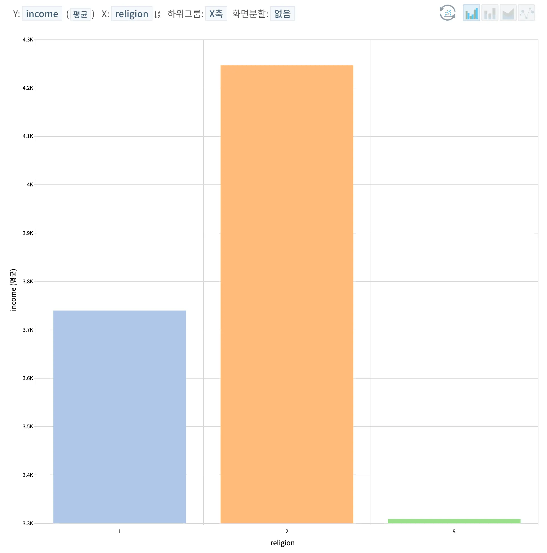 종교의 경우, 종교 보유 여부에 따른 직접적으로 소득에 영향을 주지 않을 것이라 예상하였지만 2) 무교의 경우 조금 더 높은 연소득을 보여주고 있다는 것이 흥미로웠다. 9) 데이터 범주의 경우 오류로 보여져 무시하기로 하였다.