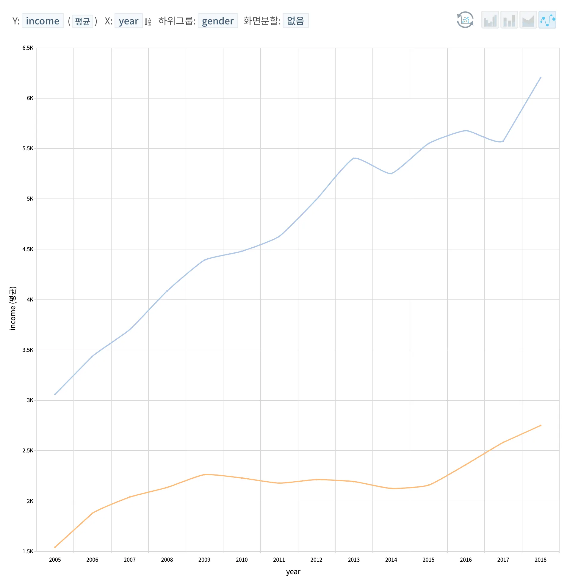 성별의 경우, 본 데이터셋 내 데이터가 수집된 시기의 사회적 여성 근로자들의 근무 환경이나 여러가지 사회 현상을 돌이켜 보았을때, 여성보다는 남성의 소득이 조금 더 높을 것이라 예상하였고 시각화를 통해 남성 가구주일 때 2005년 기준, 약 1.5천만원 차이나던 남녀 가구주 일때의 각각 년 소득 차이가 2018년 기준, 약 3천만원 이상으로 남성 가구주일 때의 가구 년소득이 월등하게 높은 것으로 보여진다.