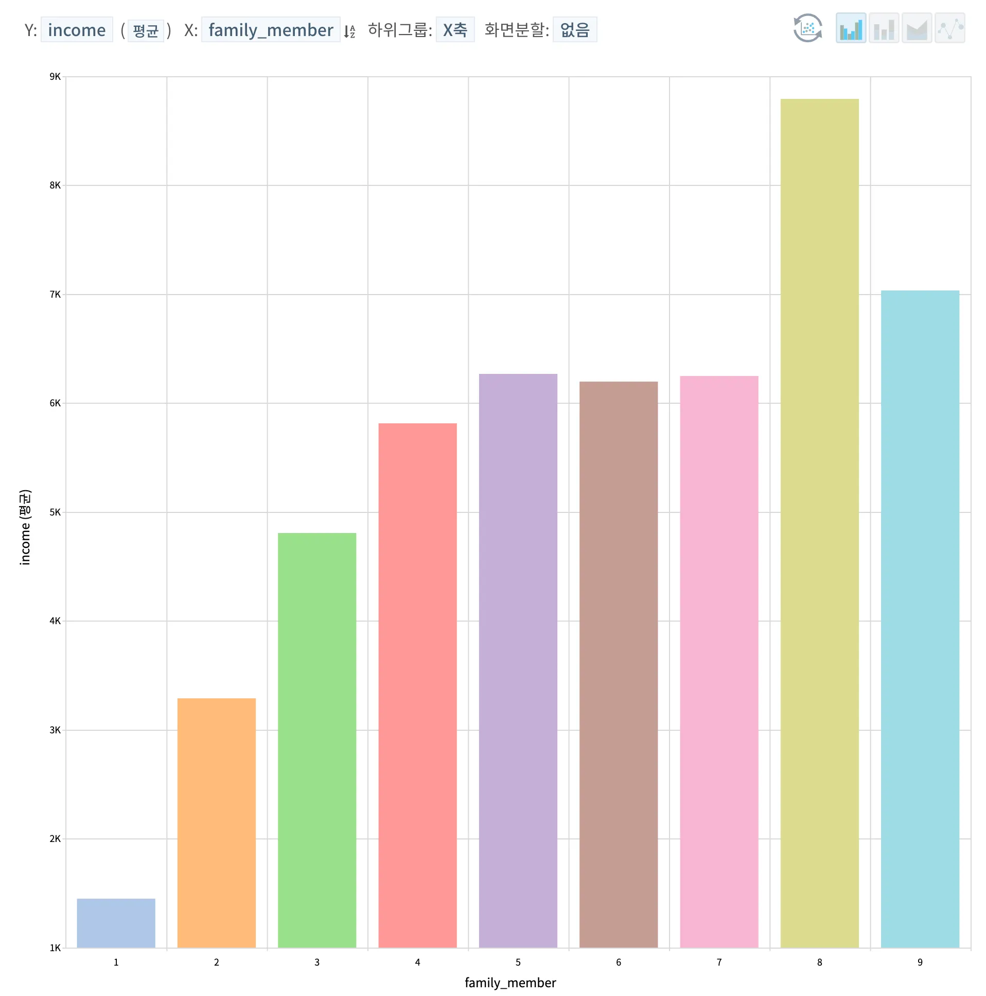 가족 구성원의 수는 1인 가구의 경우 스스로 경제활동 및 스스로를 부양해야하기에 그만큼 더 열심히 소득을 높일 수 있을 것, 그리고 부부가 맞벌이를 한다는 가정하에 1인 가구 일 때 보다 2인 가구 일때 조금 더 년소득이 높을 것, 그리고 3인 이상으로 자녀의 출생이 있는 경우 부부 중 한 쪽의 육아로 인해 경제활동이 어려우리라는 판단하에 2인, 1인, 3인, 4인, 5인 이상의 순으로 년소득은 더욱 낮게 보여질 것이라고 예상하였지만, 하기의 결과에 따라 부양가족이 많으면 많을 수록 연소득도 월등하게 높아지는 것으로 확인이 된다. 8인 가족의 경우 특이하게 상당히 높은 연소득을 보이는데 해당 데이터를 확인한 결과 표본 데이터 개수는 12개로 소수의 데이터가 상당히 높은 연소득 갖고 있기에 나온 결과로 보여진다.