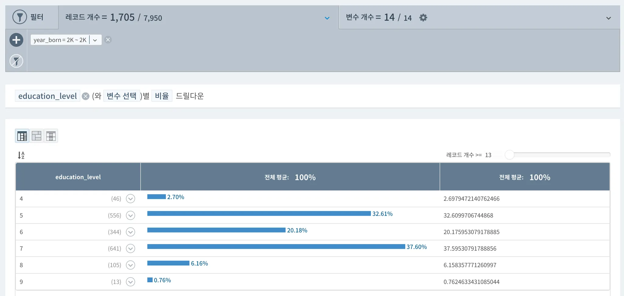 대졸자 (2년제 포함) 이상의 학력을 갖고 있는 표본수는 전체 중 약 33.19%로 확인되는데, 전체적인 데이터 표본의 연령대가 높았던 것을 기억하여, 필터링을 통해 표본 수집 마지막 시기인 2014년 기준 30-40대로 들어갈 수 있는 출생년도를 1970년도 이상으로만 놓고 보게되면 대졸자 이상의 분포가 확연하게 높아지는 것을 볼 수 있다. (하단 그래프 참조)