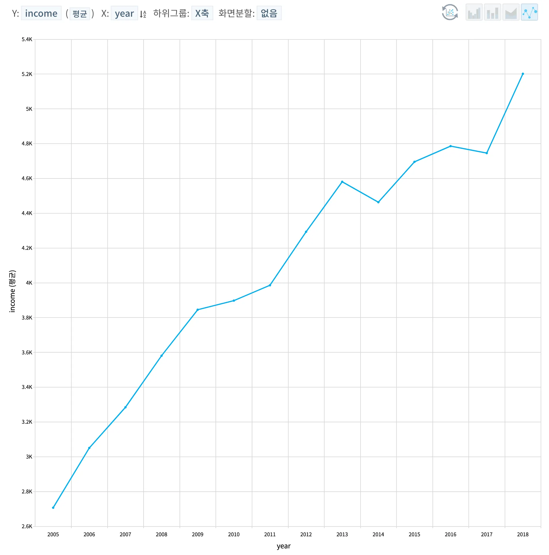 해가 지나갈 수록 국내 물가상승 및 여러가지 최저임금 상승에 따라 년도가 커질수록 가구별 평균 소득도 증가했을 것이라 예상한다. 다만, 해가 바뀔 때 한 가정 내 가족 구성원수의 변화, 지역의 이동, 직업의 변화 등 다른 변수에 따라 달라질 수 있기에 어떤 변수가 소득에 영향을 주는지를 확인하는 작업이 필요하다.
