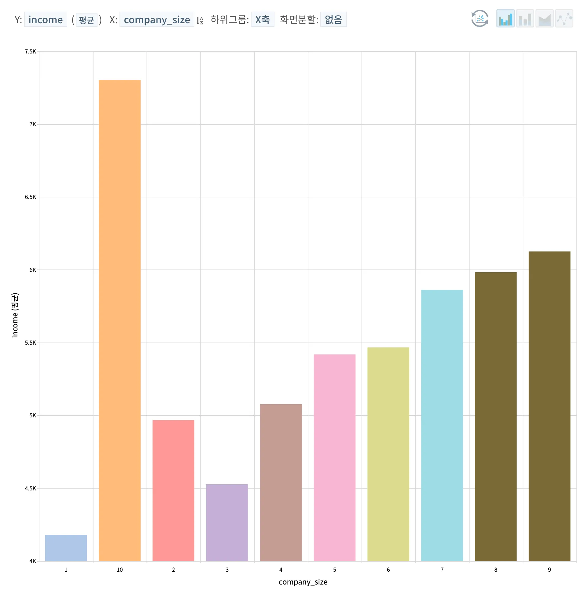 추가로 교육수준의 경우 석사 이상부터 조금 더 높은 소득을 보여줄 것이라 예상되며,중요한 변수 두가지는 “직업”과 “회사 규모”로, 직업군에 따라 소득금액이 차이가 날 것이라 판단되나 정확히 어떤 직업군에 따라 달라질지는 EDA를 통해 확인해보고자한다. 회사 규모는 크면 클수록 대기업이라는 가정에 따라 소득이 더 높게 보여질 것이라 예상된다.