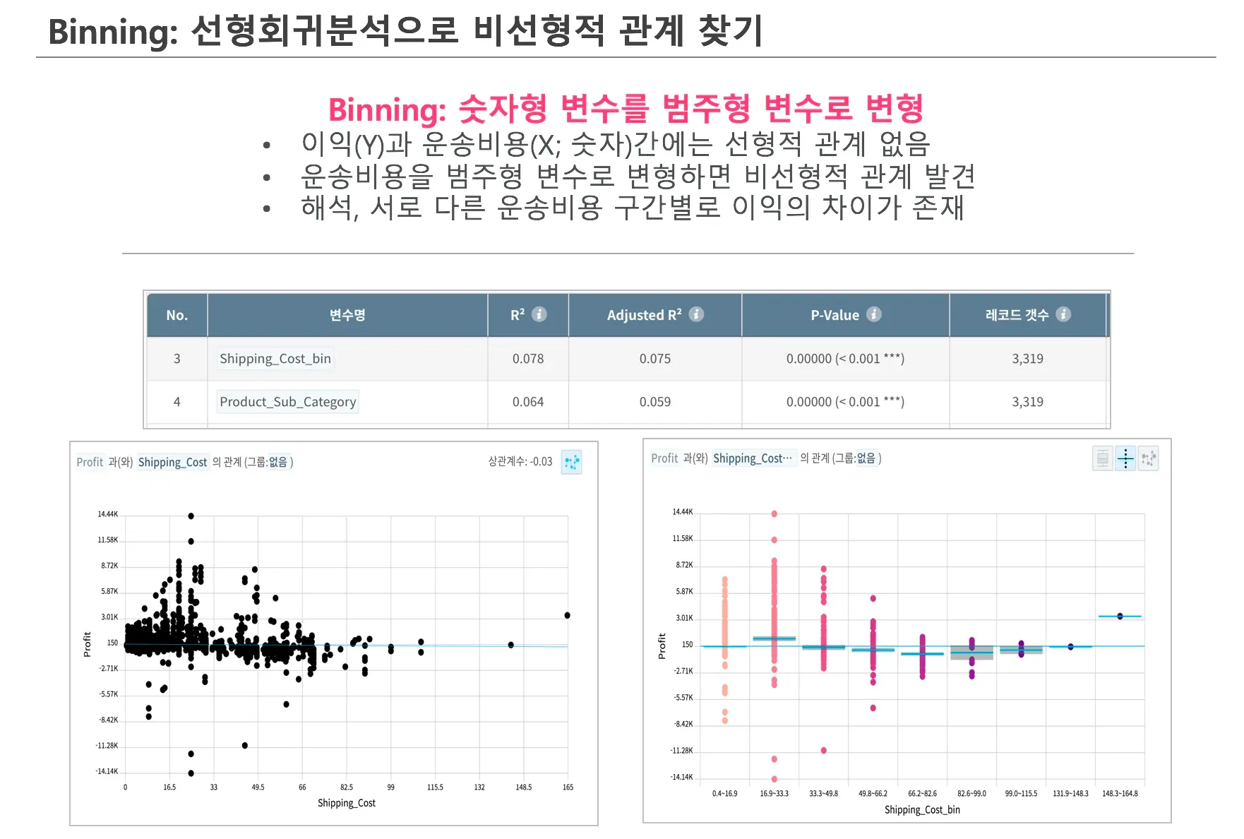 숫자형 변수를 범주형 변수로 자동으로 가공하면 비선형적 패턴을 찾거나 보다 직관적인 시각화 표현이 가능해집니다. 즉, 숫자 변수로는 안 보이던 패턴을 범주형 변수 가공을 통해 확인할 수 있습니다.