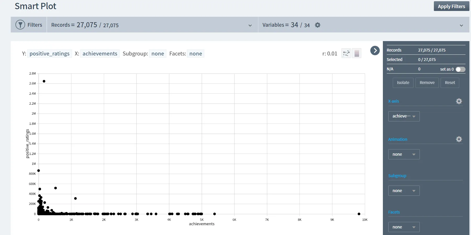 x축을 업적에 고정시키고, 각각 플레이 시간/긍정적인 반응의 수/부정적인 반응의 수를 y축으로 놓고 분석한 결과입니다. 전체적으로 0 주변에 점들이 모여 있음을 볼 수 있습니다.
