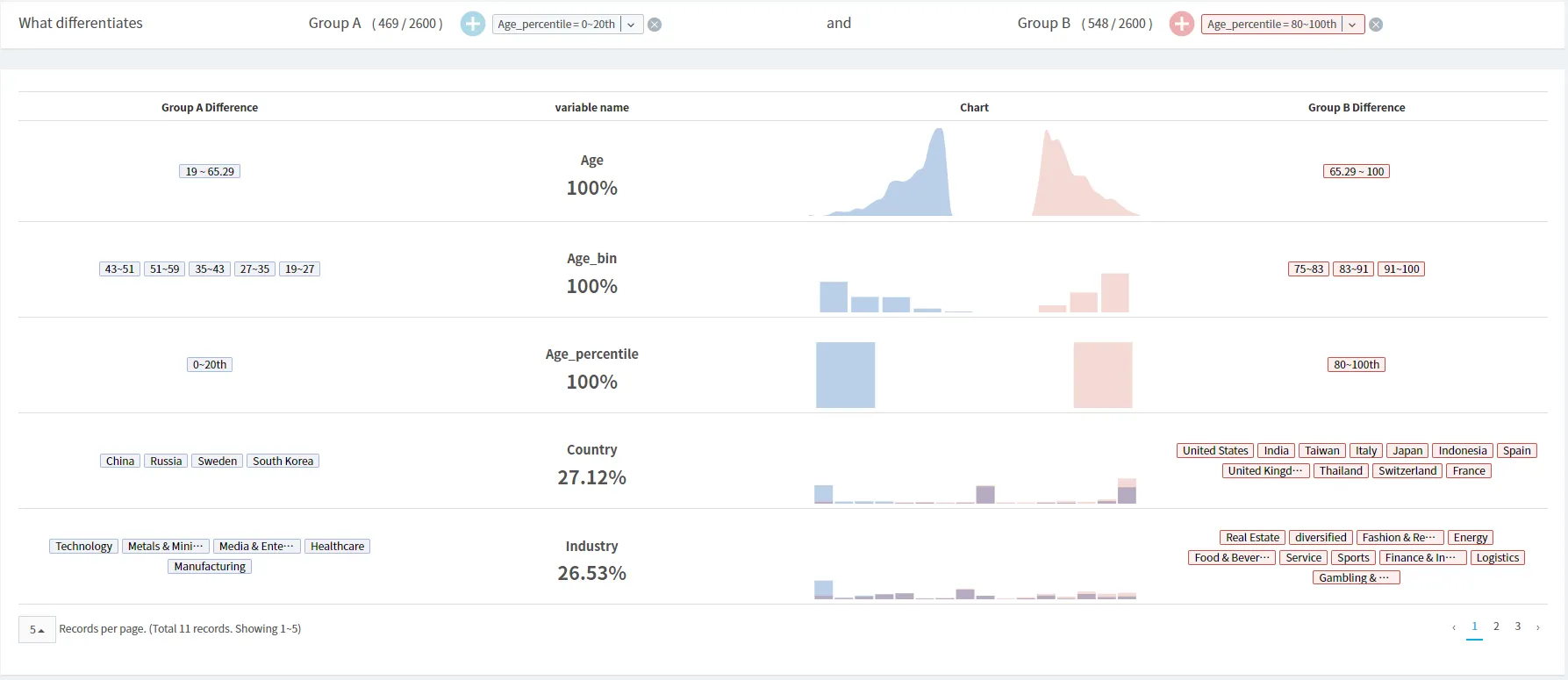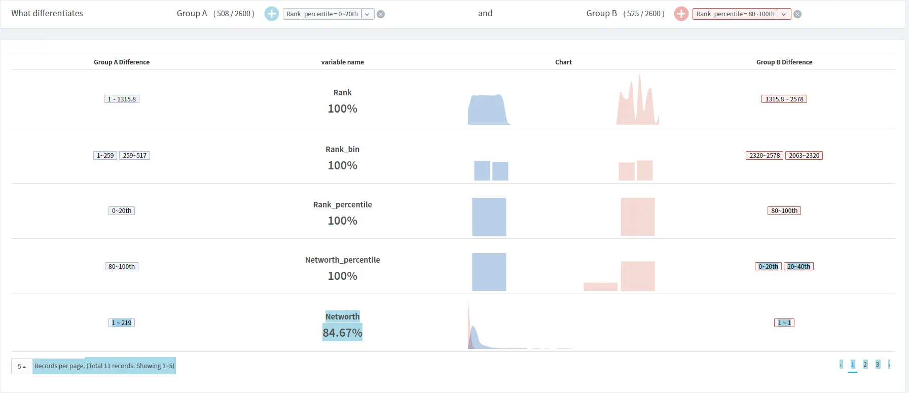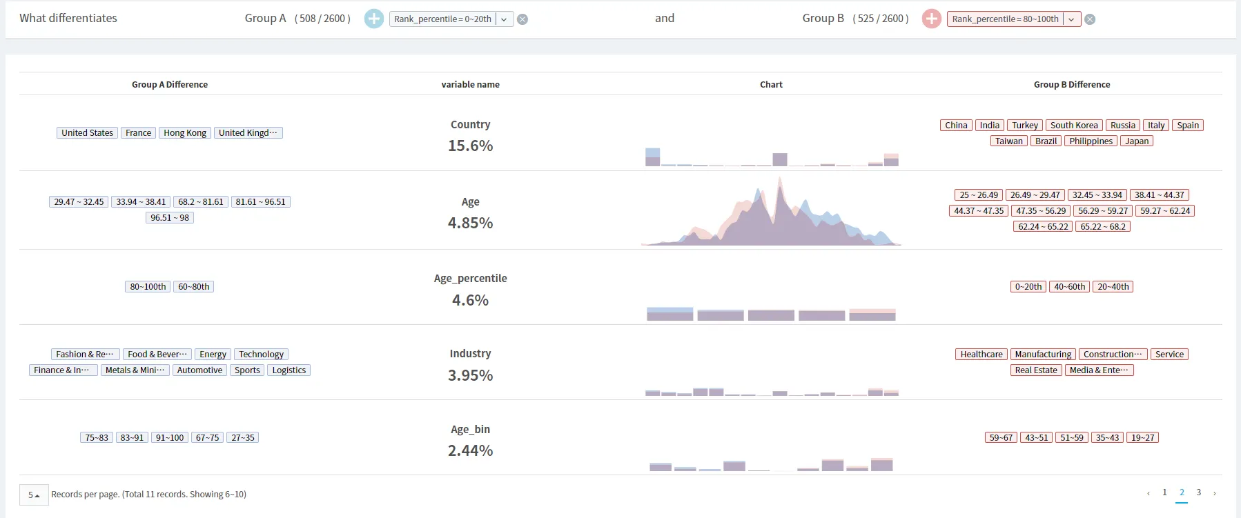 순위 상위 20%의 백만장자와 하위 20%의 백만장자를 비교했을 때, 상위 20%의 백만장자는 서구권 출신이 많았고, 하위 20%의 백만장자는 다양한 나라의 출신의 백만장자가 많았다. 아직까지는 서구권에 부가 치우쳐 있음을 알 수 있다.