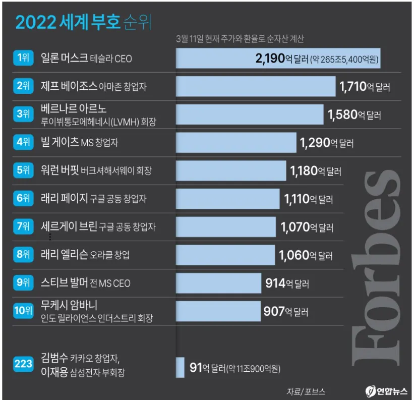 매년 포브스에서는 백만장자 순위를 발표한다. 지난 4월에도 포브스에서는 2022년의 백만장자 순위를 발표했다.