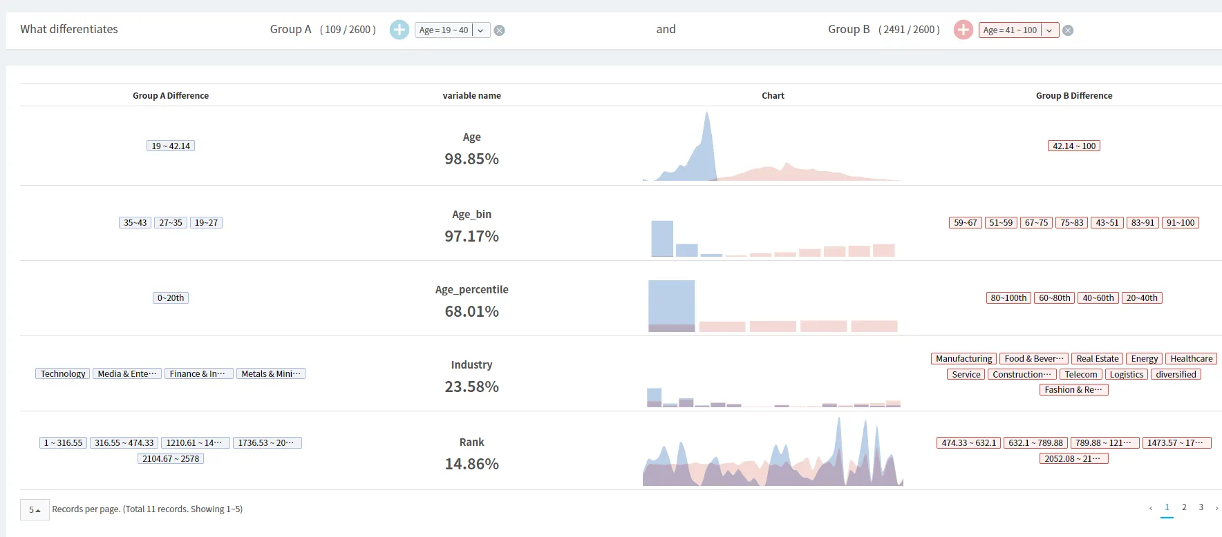 40세 이하의 백만장자는 기술, 미디어와 엔터테인먼트, 금융과 투자 등 비교적 최근에 발전한 산업 분야에 많이 종사하고, 40세 이상의 백만장자는 제조업, 부동산 등 전통적인 산업 분야에 많이 종사함을 알 수 있었다.