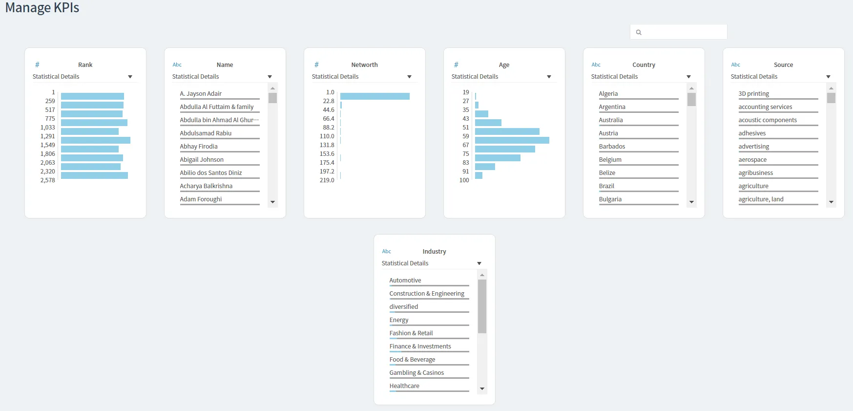 기본 데이터를 보았을 때 백만장자는 19세부터 100세까지의 다양한 나이의 분포를 보이고 있지만 59-67세 사이의 백만장자가 가장 많았고, 미국(28%)과 중국(20%)에서 백만장자가 많이 나왔다. 재산의 출처는 부동산(6%)과 투자(4%)의 순이었으며 산업 분야는 금융과 투자(15%), 기술(13%)의 순으로 백만장자가 많았다.
