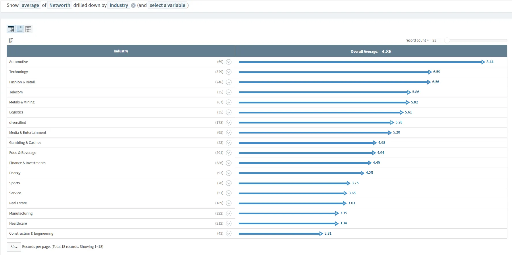 기본적인 데이터셋 정보에 의하면 백만장자가 많이 종사하는 산업 분야는 금융과 투자(15%), 기술(13%)의 순이었다. 하지만 순자산을 보면 자동차 분야가 1위이고, 2위는 기술이었다. 기술이 2위인 것은 동일하지만 전통적인 제조업(자동차)가 아직까지는 가장 부를 많이 창출하는 산업 분야인 것 같다.