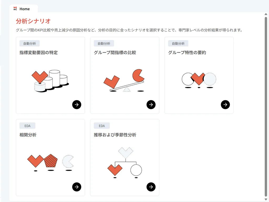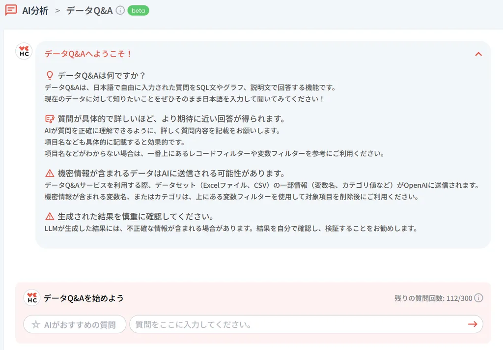 HEARTCOUNTのAI分析は、自然言語を基盤として誰でも簡単に分析を始められる機能です。 分析担当者が提案する質問に沿って進めることも、自分で質問を入力してデータに隠れたパターンやインサイトを確認することもできます。