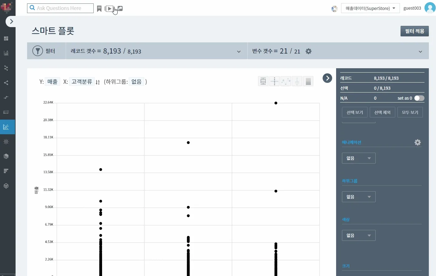 애니메이션 기능을 통해, 시간에 따라 그래프의 레코드들이 어떻게 변화하는지 확인할 수 있습니다. (*. 애니메이션 기능은 스마트 플롯에서만 제공합니다.)
