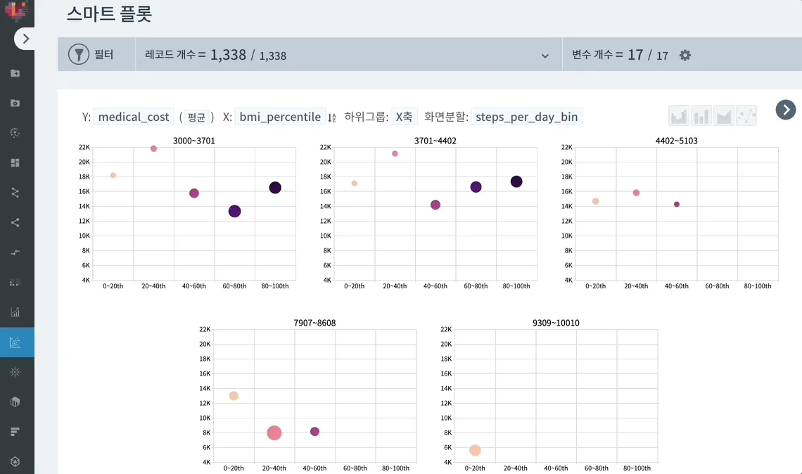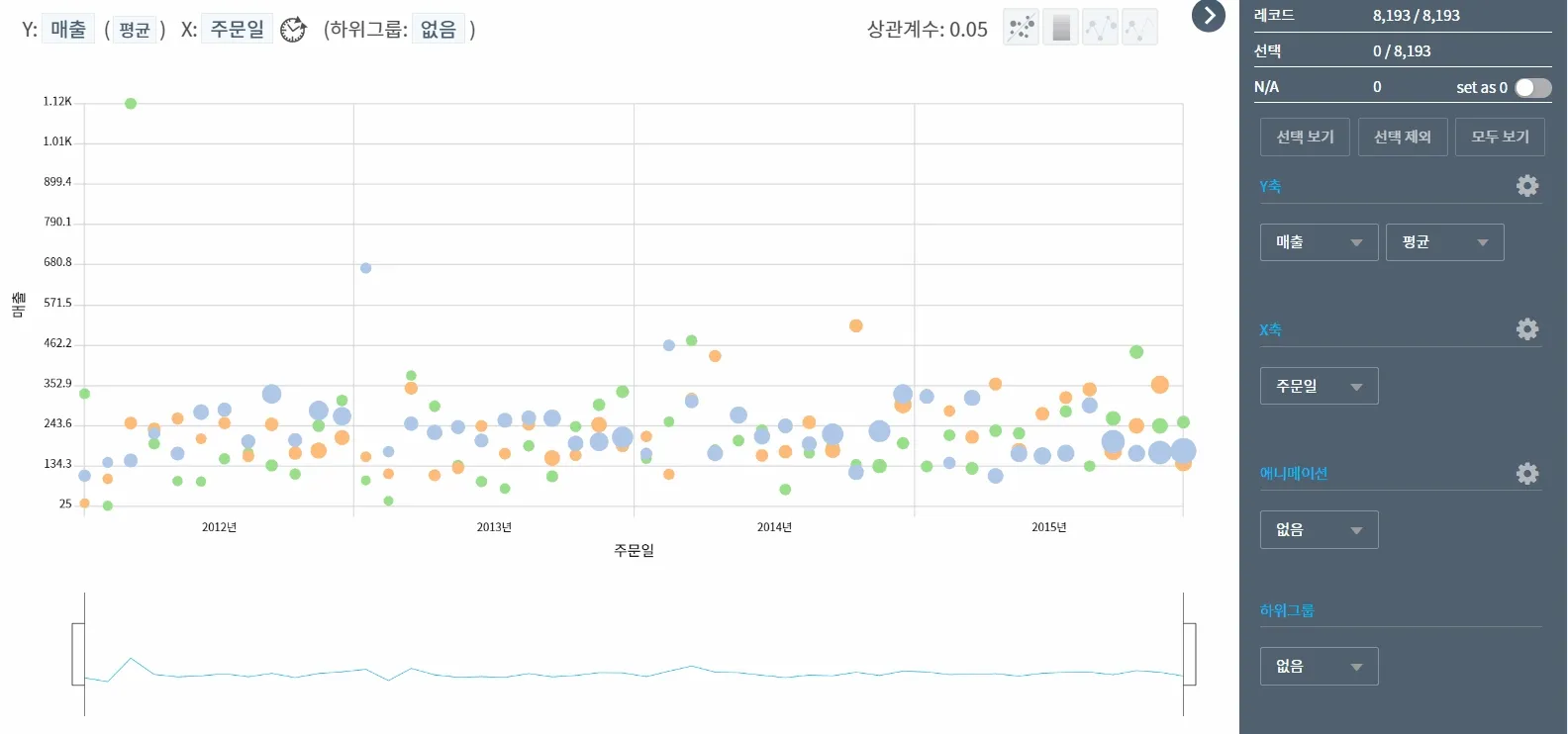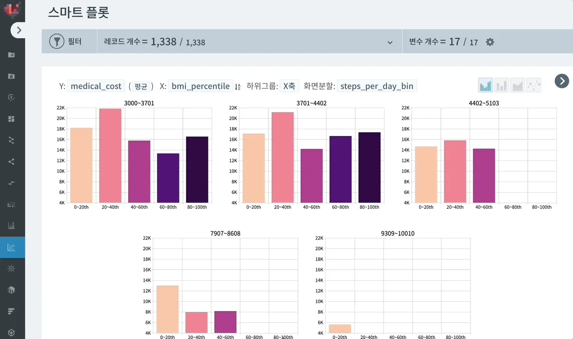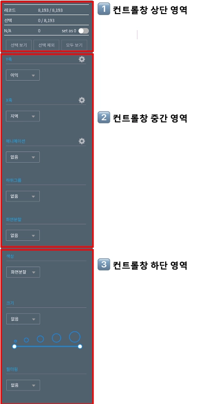 중간 영역에는 시각화 영역의 맨 위 (X축, Y축, 하위 그룹, 화면분할) 상단에 표시된 것과 동일한 변수가 나타납니다. 각 콤보박스를 클릭하여 원하는 변수를 선택하면 선택된 변수에 해당되는 데이터 시각화 화면을 볼 수 있습니다.