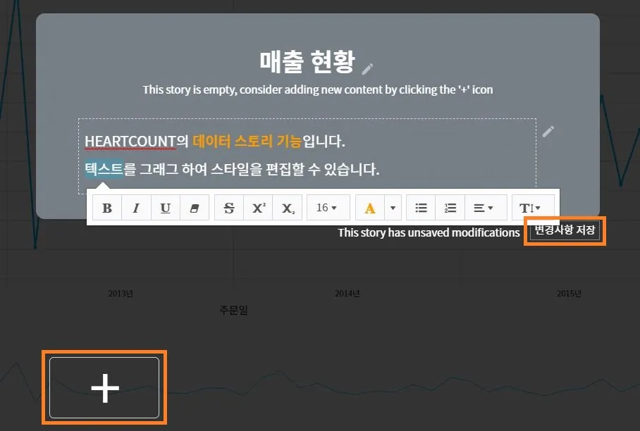 스토리 제목을 작성하고 +아이콘을 클릭하여 첫 번째 스토리를 추가합니다. 글자를 드래그하면 텍스트 편집기가 나타나 글자 스타일을 바꿀 수 있습니다. 시각화 편집 모드로 전환하려면 텍스트 편집 상자 외부의 아무곳이나 클릭하세요. 편집 후, 오른쪽 하단에 변경사항 저장 아이콘을 클릭하여 저장합니다.