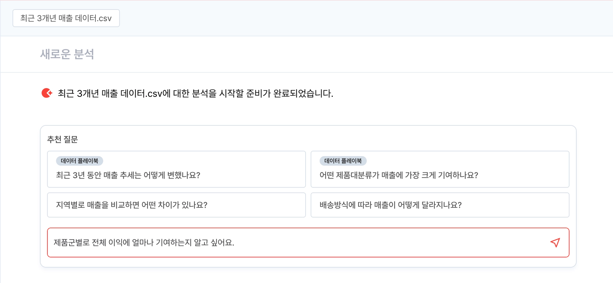 데이터셋 연결이 완료되면 주어진 데이터셋에 적합한 좋은 추천 질문을 LLM이 자동으로 생성합니다. 추천 질문을 선택해 데이터 분석을 빠르게 시작해보세요. 궁금한 질문을 자연어로 직접 입력할 수도 있습니다.