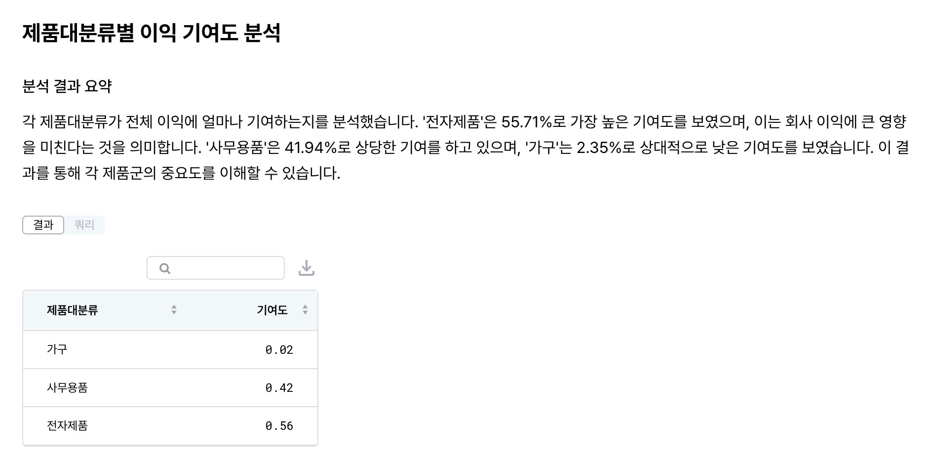 분석 질문이 확정되면 AI Agent가 분석 목적에 맞는 방법을 설계하고, 데이터 조회와 SQL 생성/결과 시각화, 인사이트 생성 등 필요한 단계를 순서대로 수행합니다. 분석이 끝나면 결과 요약, 결과 테이블, 데이터 시각화 차트 를 확인할 수 있습니다.