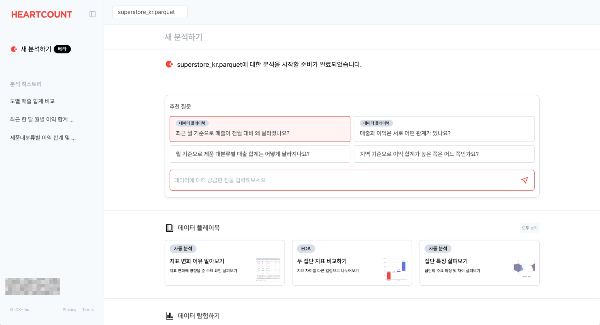 추천 질문: AI가 데이터의 특성을 파악하여 자동으로 생성한 질문들입니다. 클릭 한 번으로 분석을 시작할 수 있습니다. (예: "이번 달 매출이 달라진 이유가 무엇인가요?")