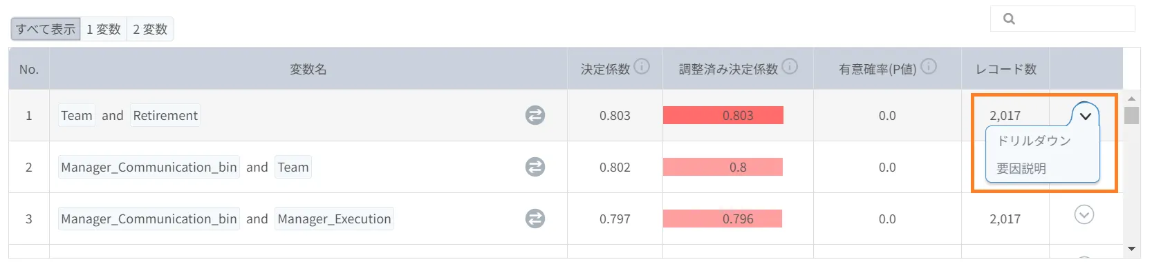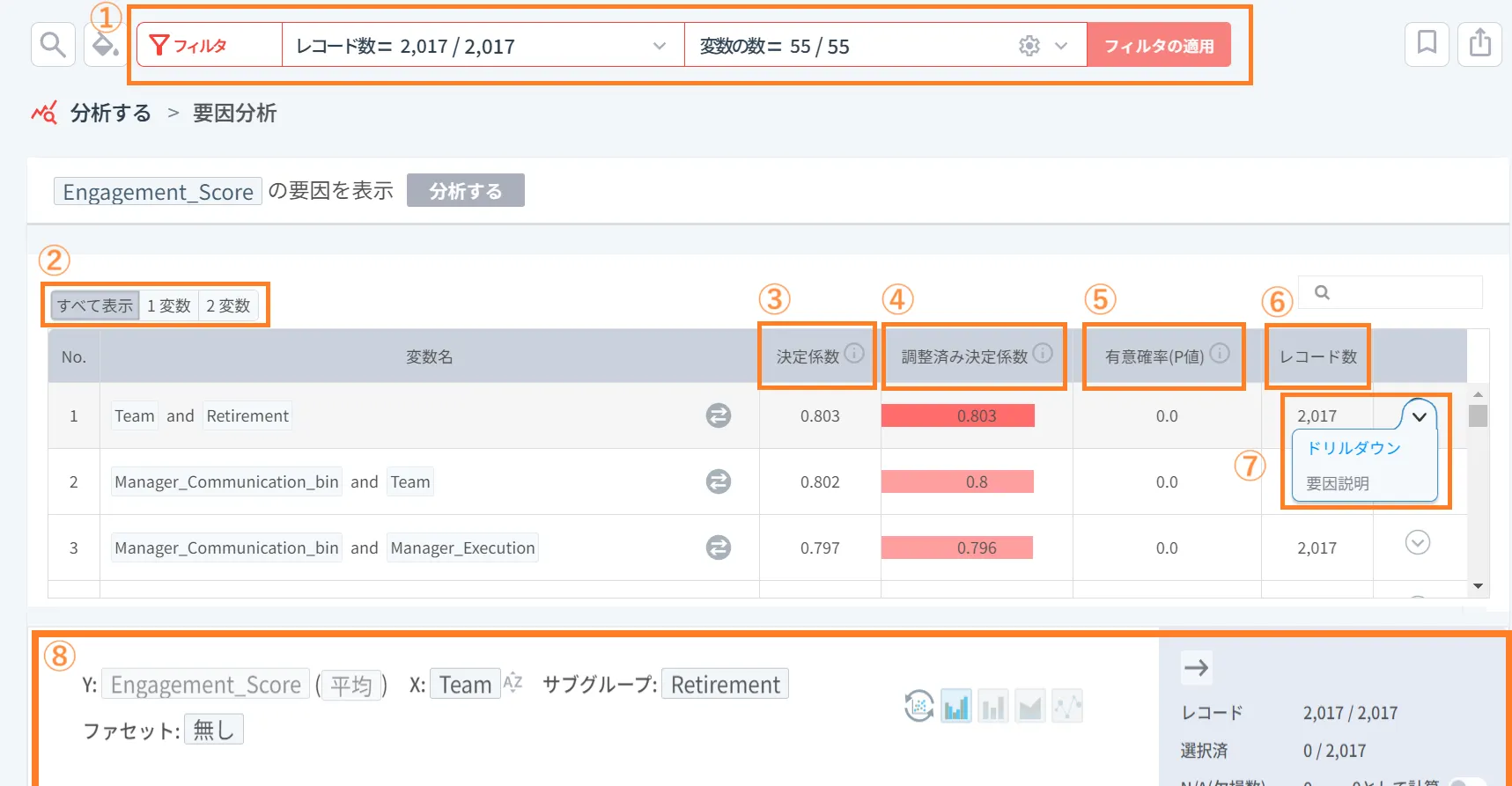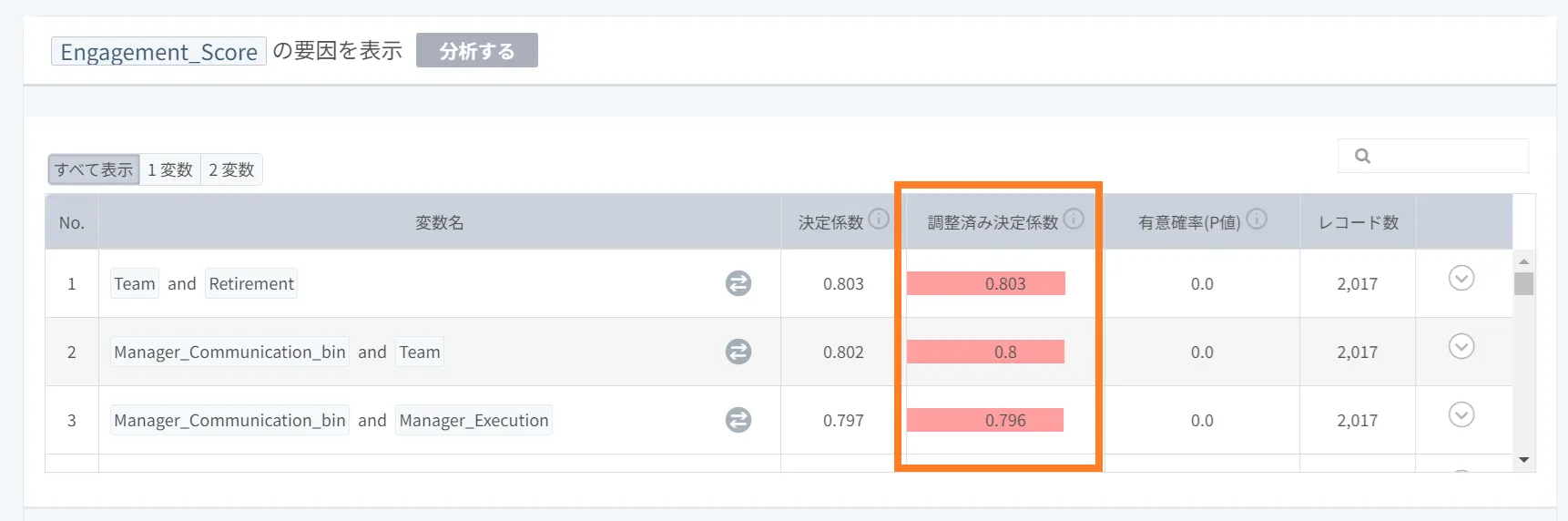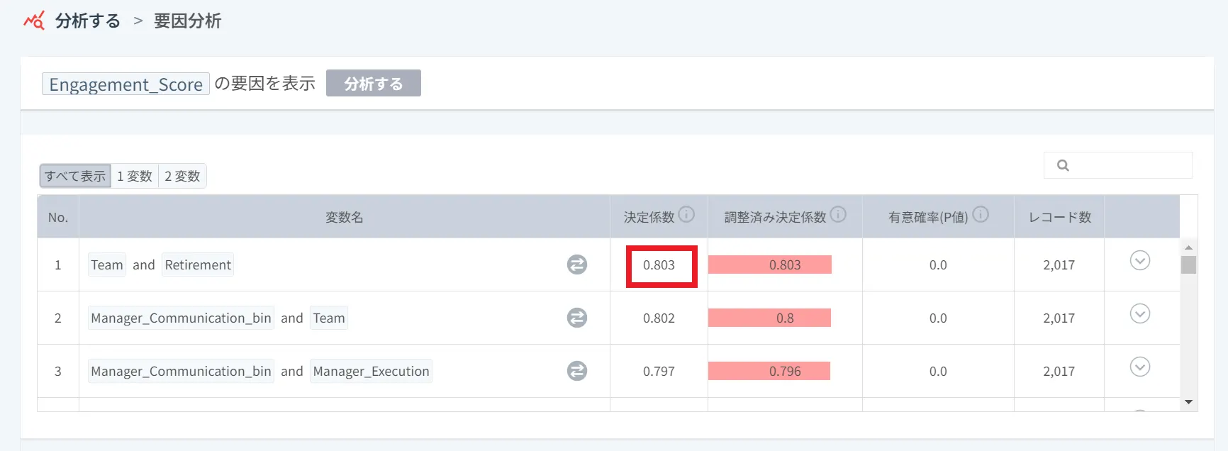 決定係数( )は選択したKPIの差(変化量)のうち、その変数で説明できる割合を示す統計値です。例えば、下の画像のように選択したKPI、つまり「従業員満足度(Engagement_Score)」を最もよく説明するのは決定係数が 0.803 で最も高い「チーム区分(Team)」と「退職区分(Retirement)」の変数の組み合わせであり、「従業員満足度」の差(変化量)のうち 80% を「チーム区分」と「退職区分」で説明できるということを意味します。