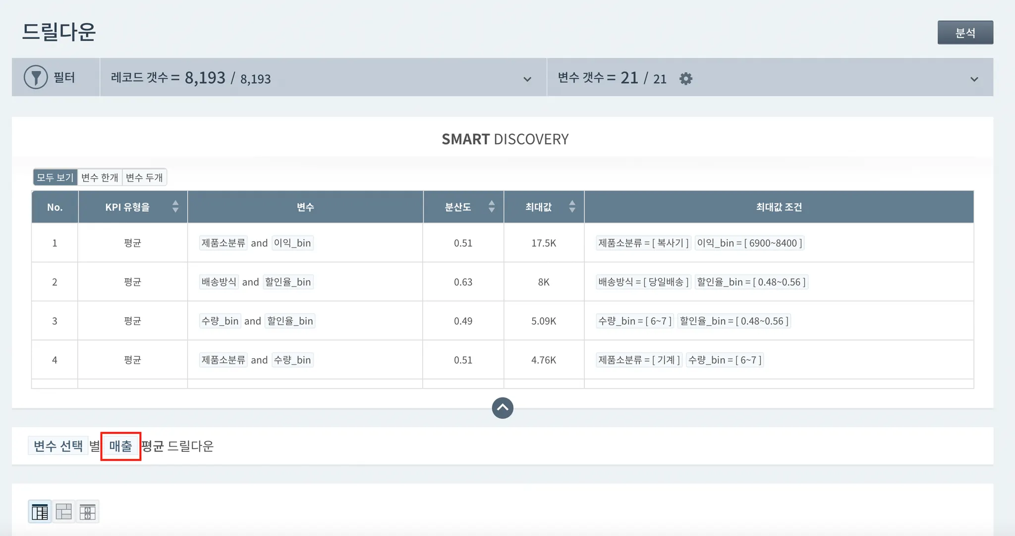 사용자가 드릴다운할 변수(아래 예시 이미지의 경우 '매출')를 먼저 선택하면, 해당 KPI에 대해 모든 경우의 수(변수의 조합)로 분석을 수행한 후 해당 KPI를 최대화할 수 있는 조건을 자동으로 발견해 드립니다.