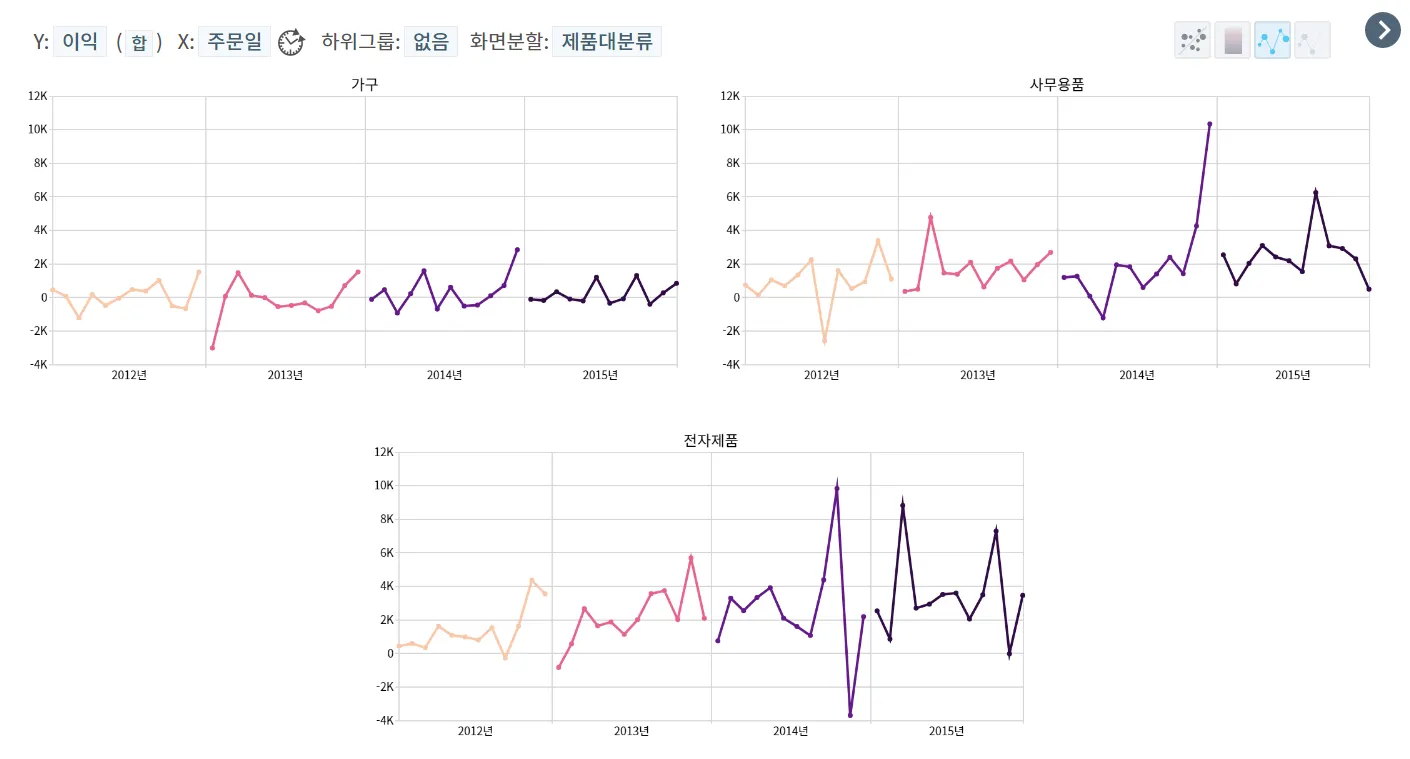 → 2014년말, 전자제품의 이익이 10월에 높았다가 11월에 낮아지는 추이