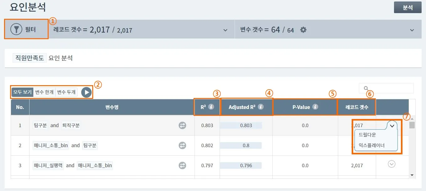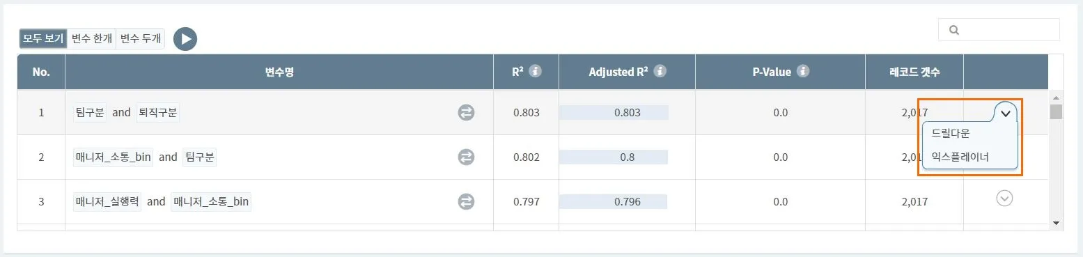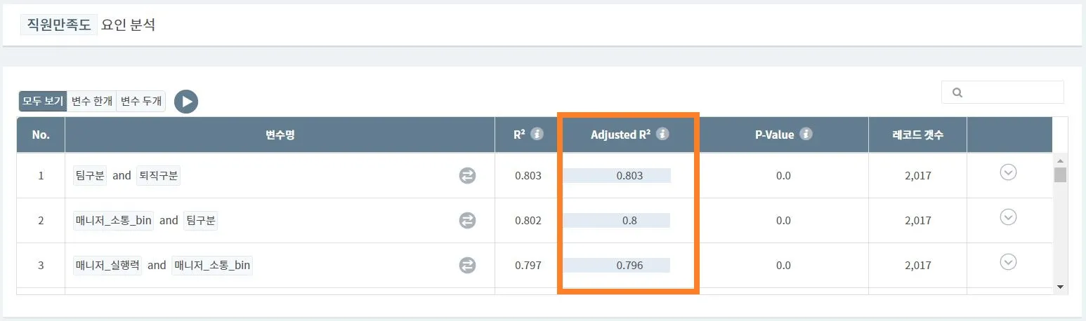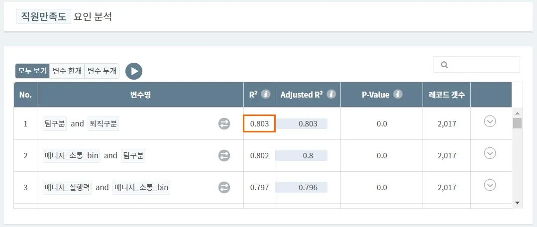 은 결정계수를 의미하며 선택한 KPI의 차이(변화량) 중 해당 변수로 설명할 수 있는 비율을 나타는 통계치입니다. 예를 들어 아래 이미지와 같이 선택한 KPI 즉, [직원만족도]를 가장 잘 설명하는 것은 이 0.803으로 가장 높은 [팀구분]과 [퇴직구분]변수이며, [직원만족도]의 차이(변화량) 중 80%를 [팀구분]과 [퇴직구분]으로 설명할 수 있다는 의미입니다.