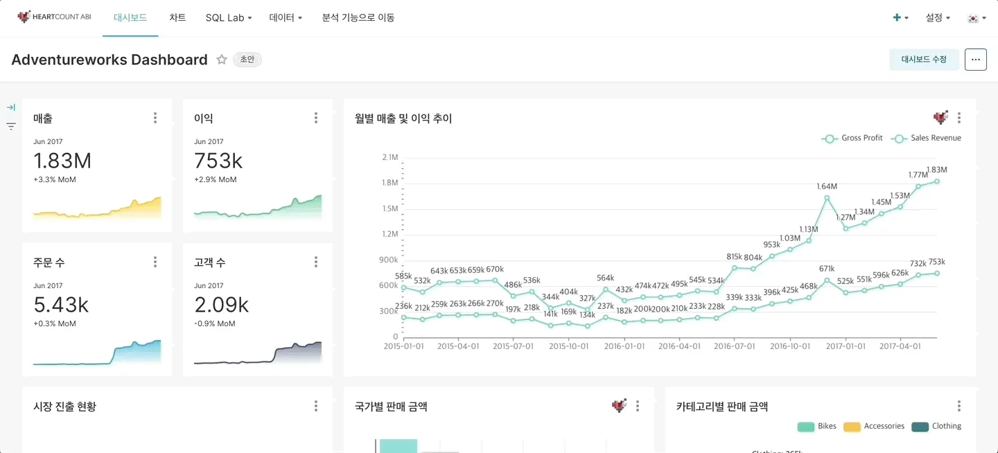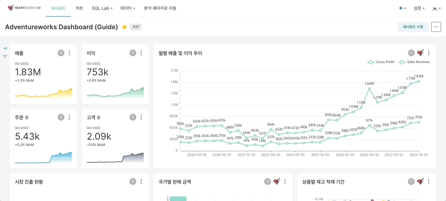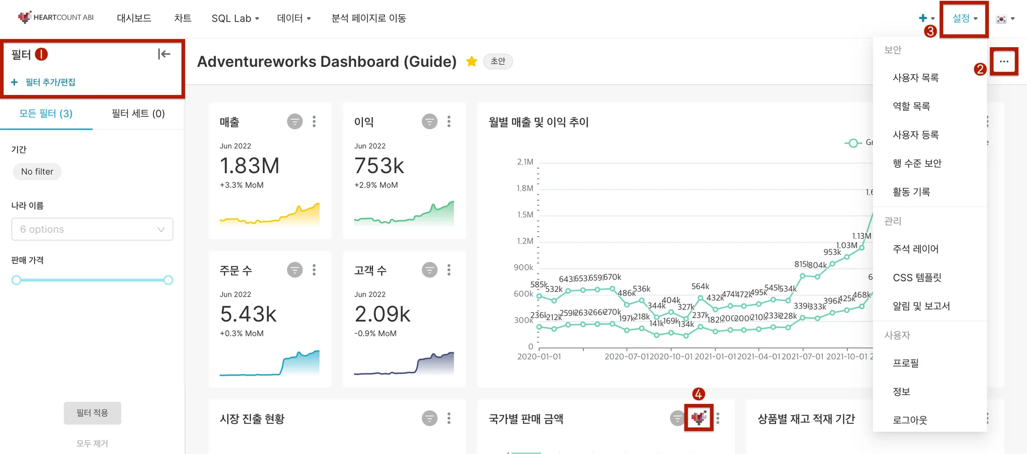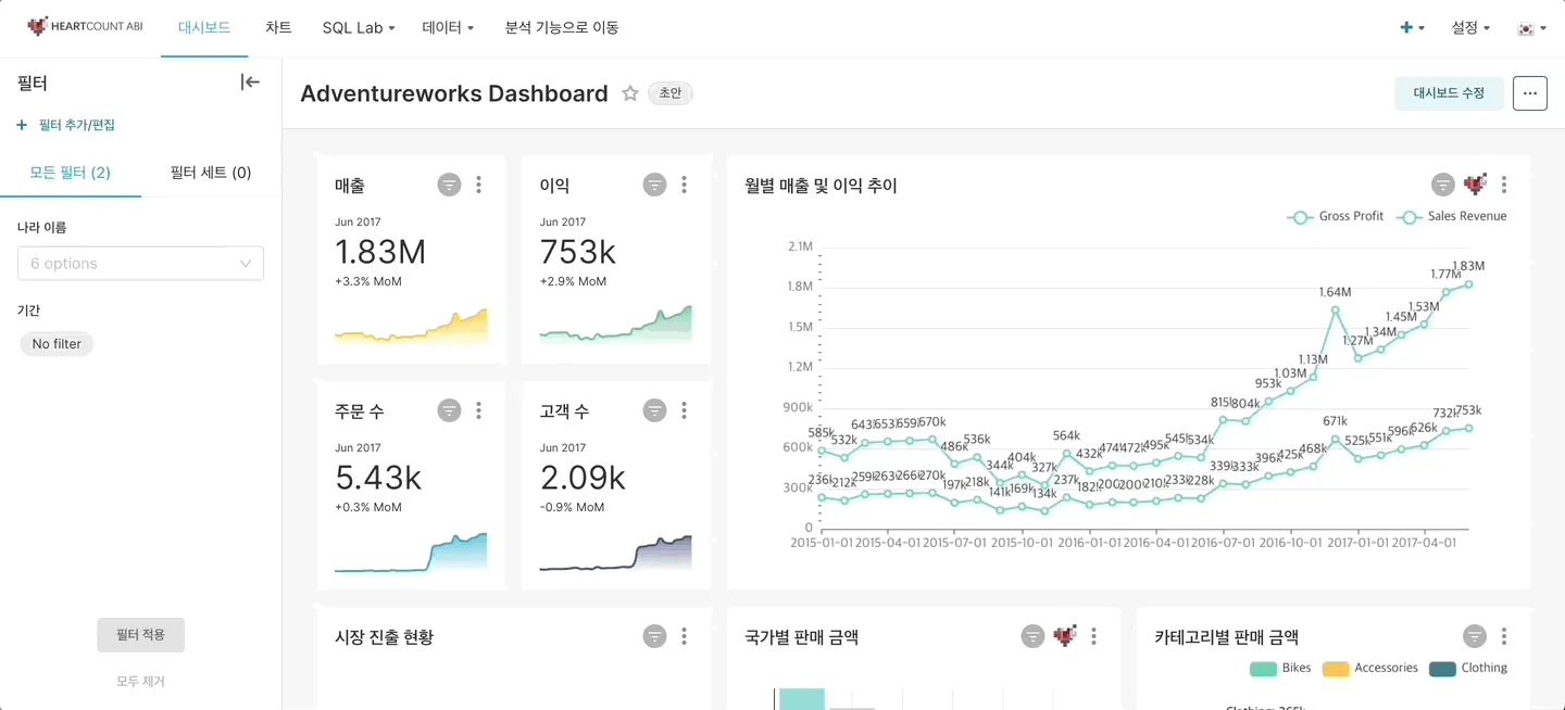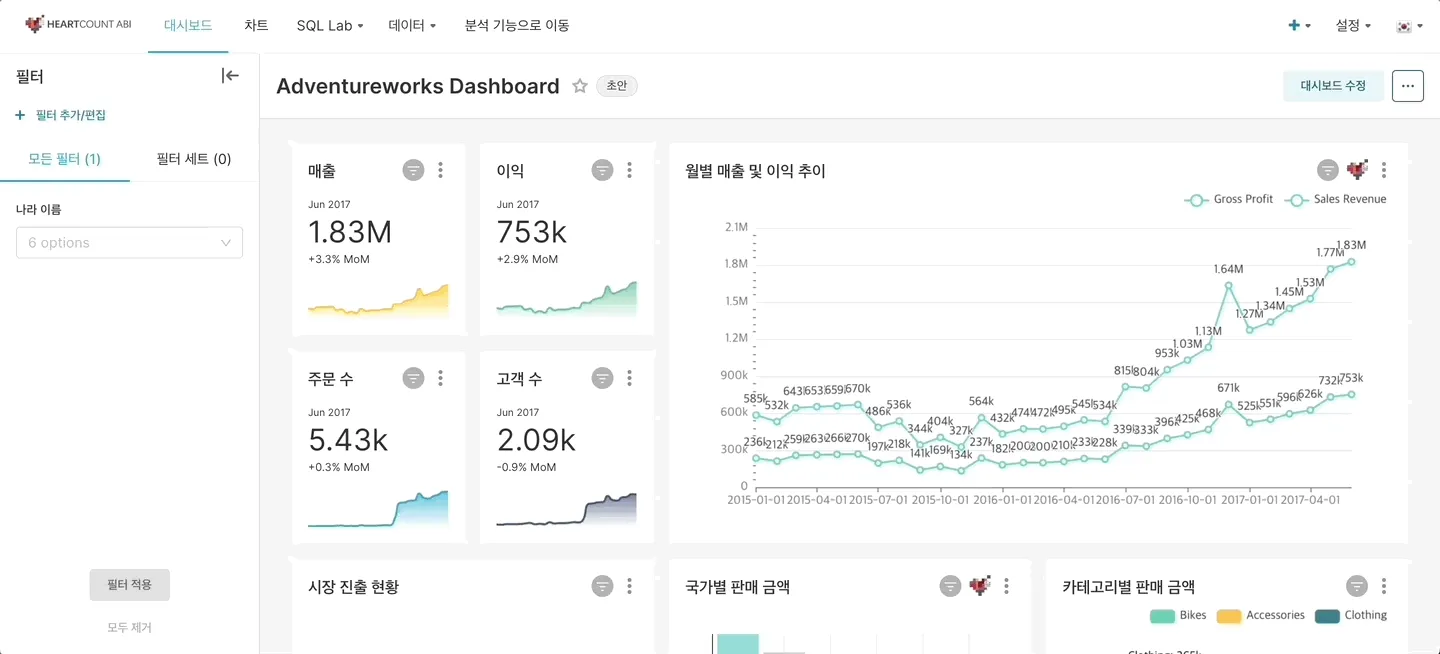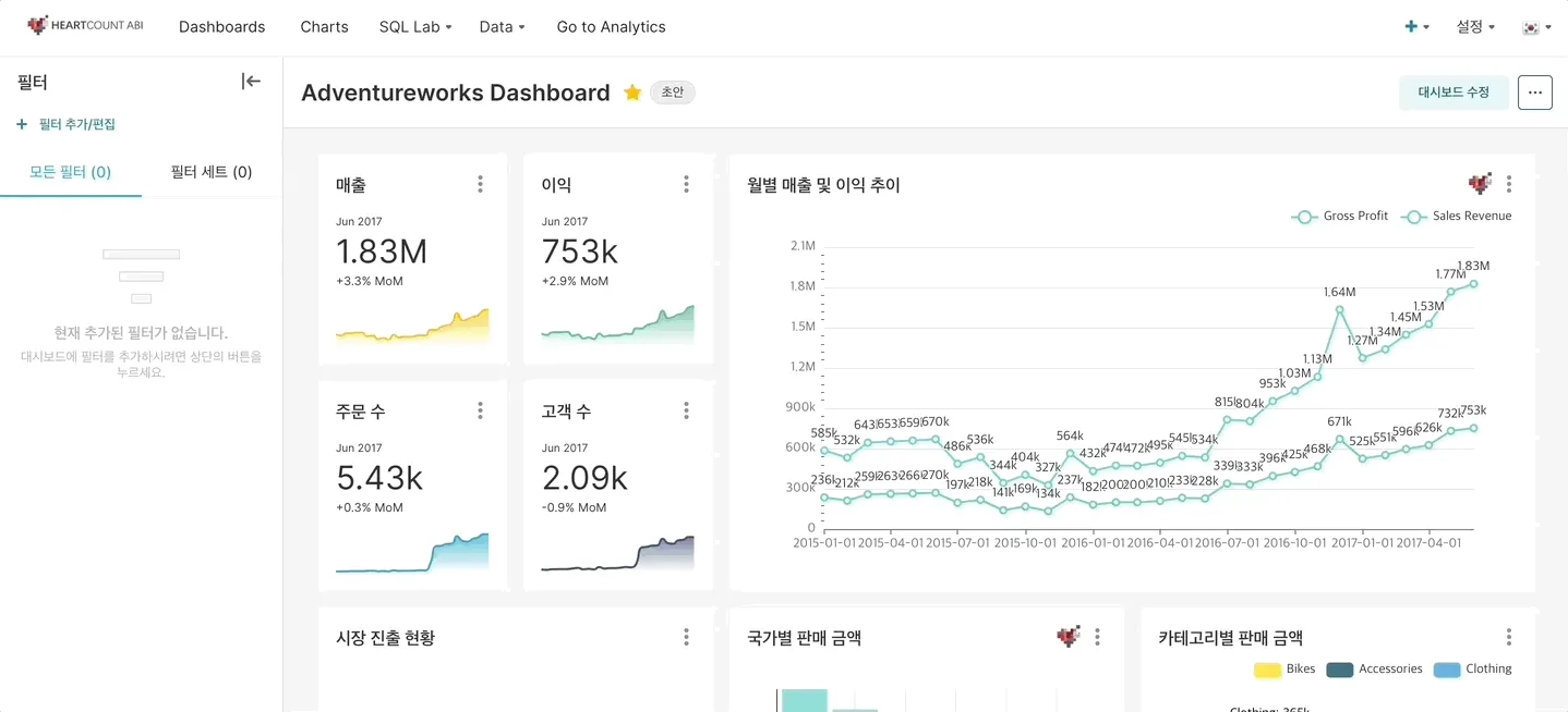필터를 추가하여 원하는 조건에 맞춰 데이터를 필터링한 대시보드를 확인할 수 있습니다.