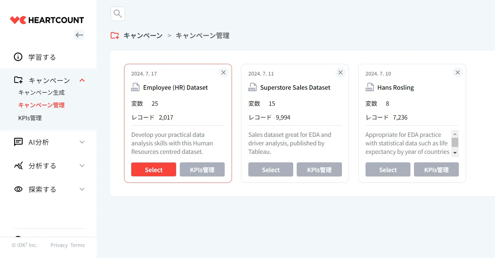 キャンペーン管理は、コンピュータに保存されているファイルを管理するフォルダと似ています。HEARTCOUNTでは、ファイルがキャンペーンになります。複数のファイルをキャンペーンとして登録しておいて、その都度、他のキャンペーンに移動したり、削除したりして、自分が登録しておいたキャンペーンを整理したいときに使用すると便利なメニューです。