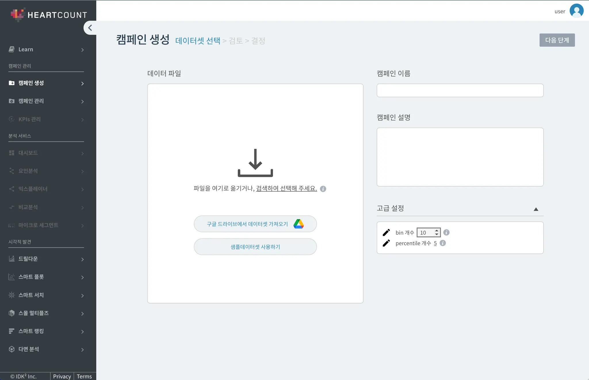 ① 하트카운트 로그인 후 캠페인 생성 화면에서 Bin 개수를 정할 수 있습니다. 사용자가 수동으로 설정하지 않을 경우, Default로 Bin은 10개, Percentile은 5개 적용되어 있는 것을 볼 수 있습니다.