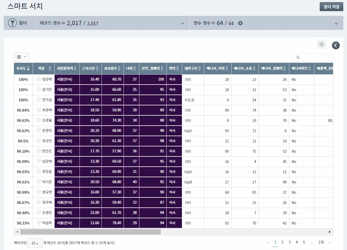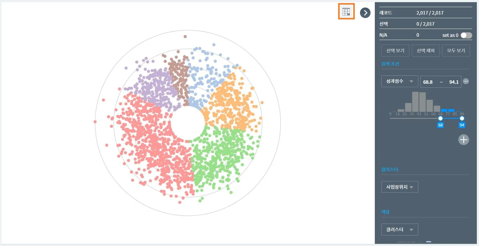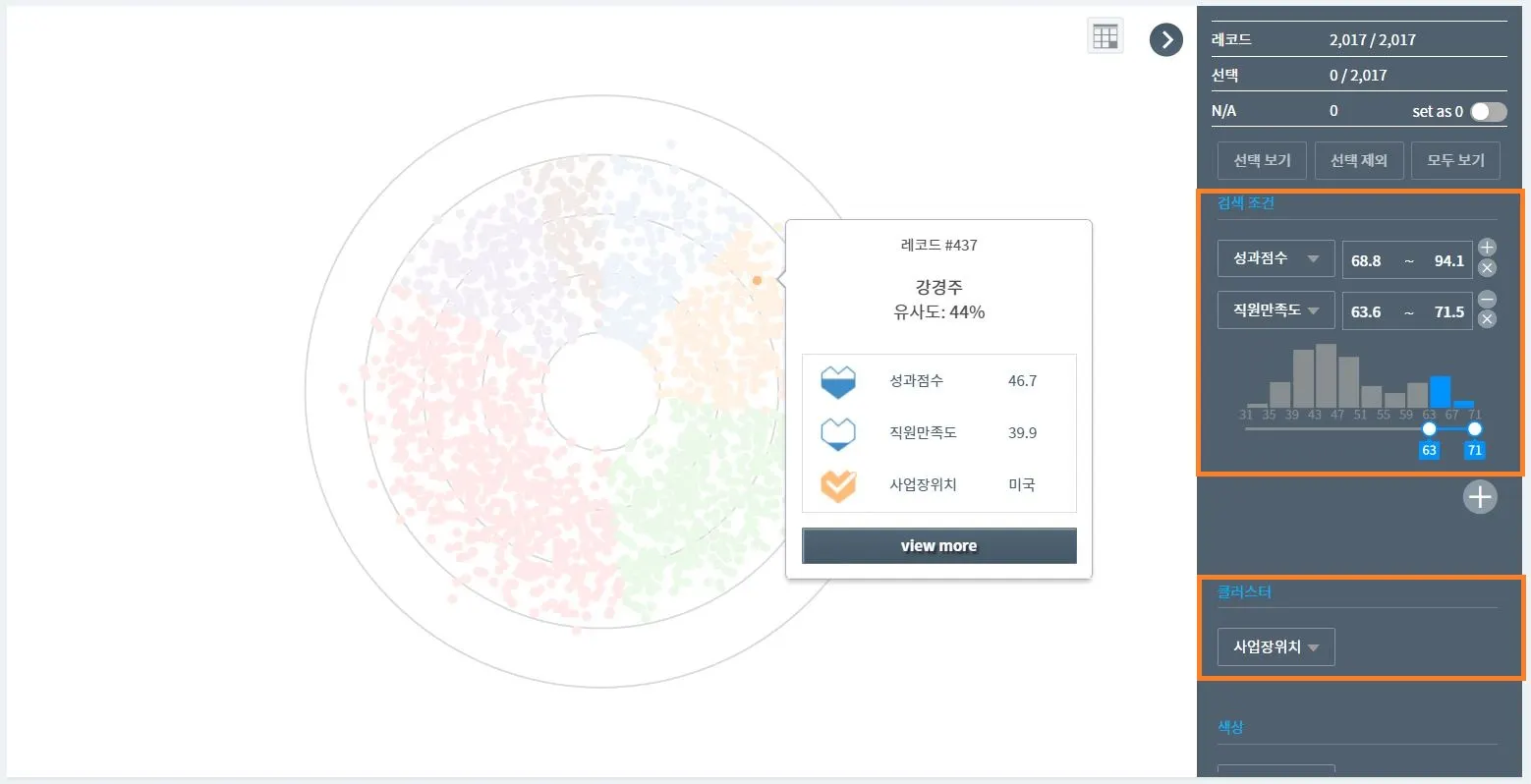 아래 이미지는 전체 직원을 [사업장 위치]별로 클러스터링 후, [성과점수: 68.8~94.1]과 [직원만족도: 63.6~71.5] 조건을 입력하여 나타낸 스마트 서치 화면입니다.