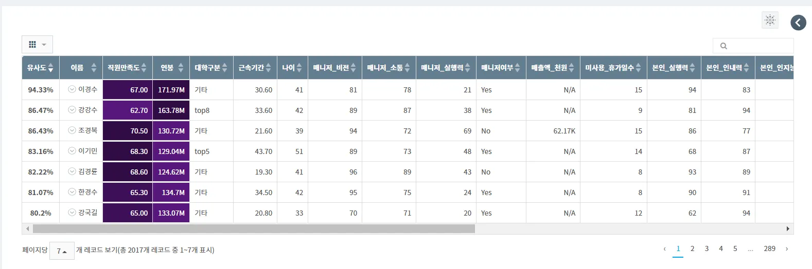 아래 예시에서는 [직원 만족도]와 [연봉]을 검색 조건으로 사용하고 있어 해당 셀에 색이 채워지게 됩니다.