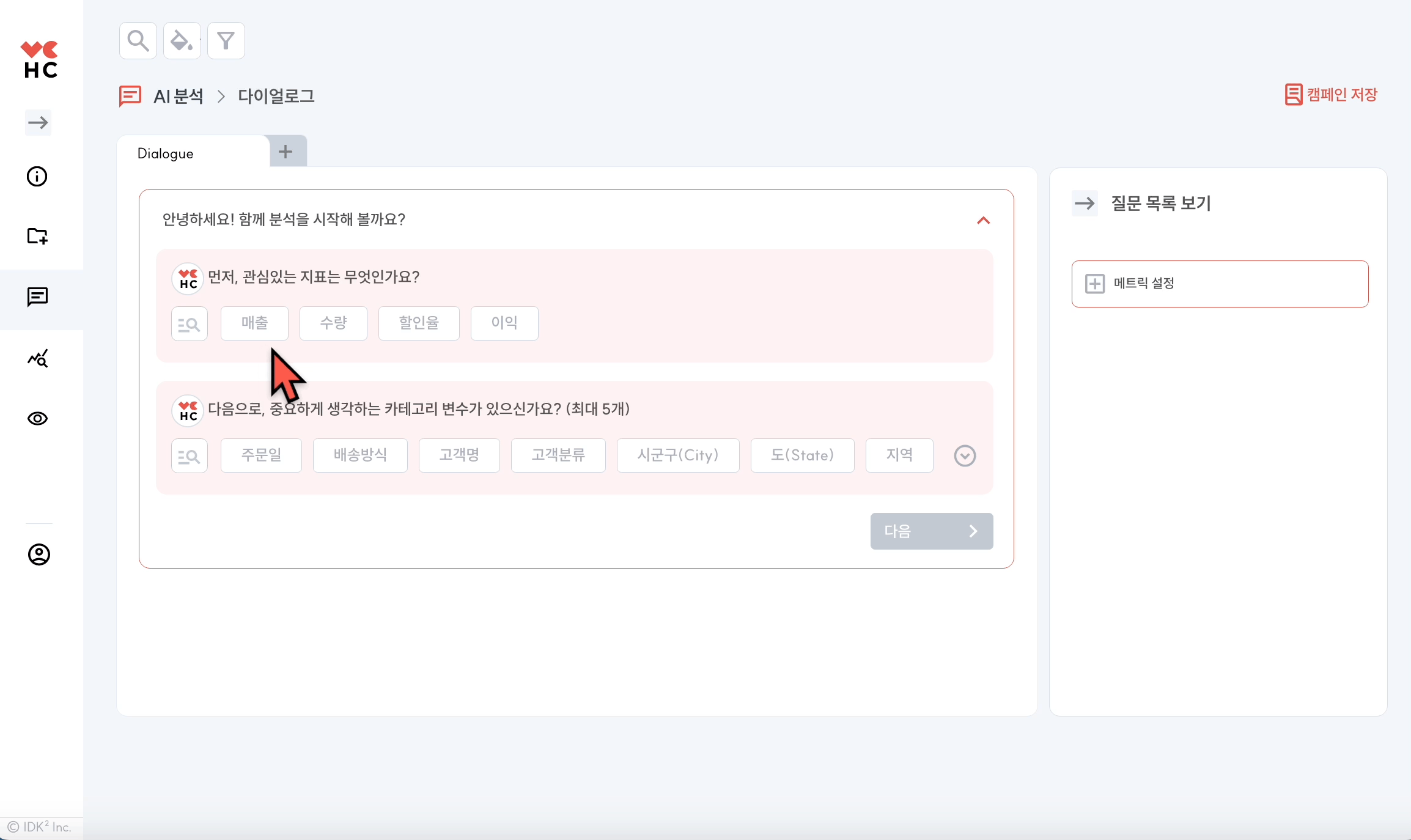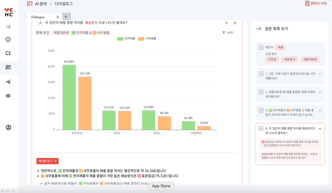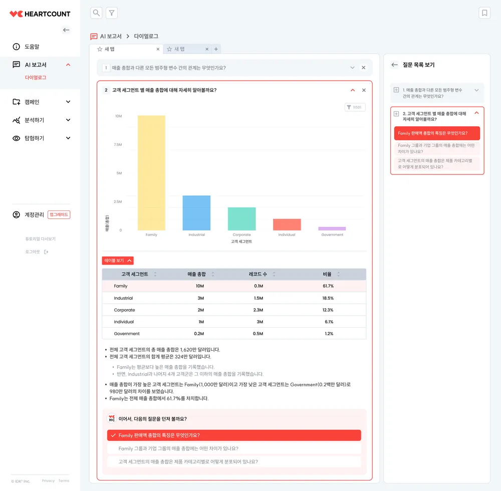 Dialogue는 HEARTCOUNT의 대화형 AI 분석 기능으로, 주어진 데이터셋에 대한 질문과 해석을 제공하며 사용자와 대화하듯 분석을 수행하는 기능입니다.