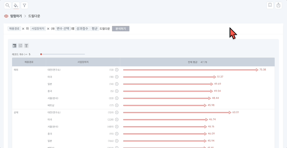 탐험하기의 ‘드릴 다운’ 메뉴에서 테이블 형식으로 내보내기