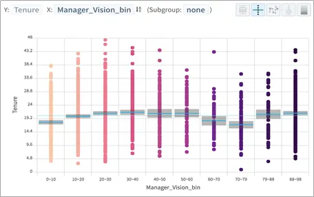 그러나 두 번째 이미지와 같이 숫자형 변수인 리더십 점수를 범주로 자동 가공하여 통계적으로 유의한 비선형 패턴을 발견할 수 있습니다.