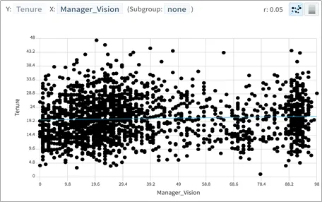 첫 번째 이미지를 통해 직원 재직기간과 리더십 점수 사이에 매우 약한 선형적 관계(r: 0.05)가 존재하는 것을 알 수 있습니다.