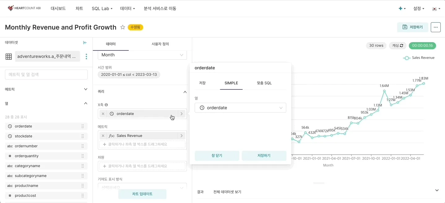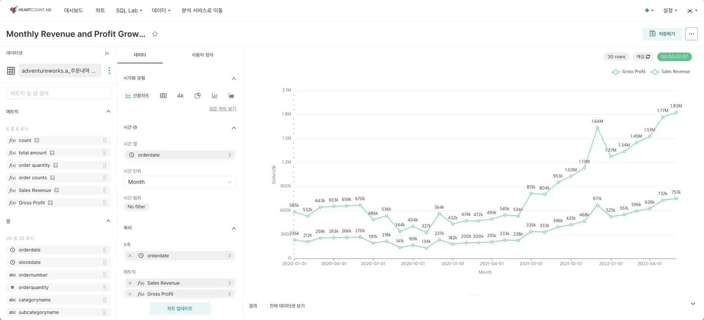 차트 생성 시에 자동으로 만들어지는 쿼리문을 통해 데이터셋이 생성됩니다.