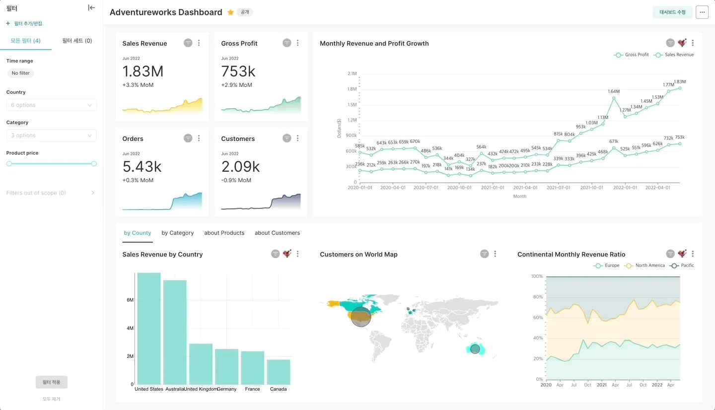매번 바뀌는 지표를 자동으로 업데이트해주며, 대시보드를 다운로드하여 보고서로 활용할 수 있습니다.