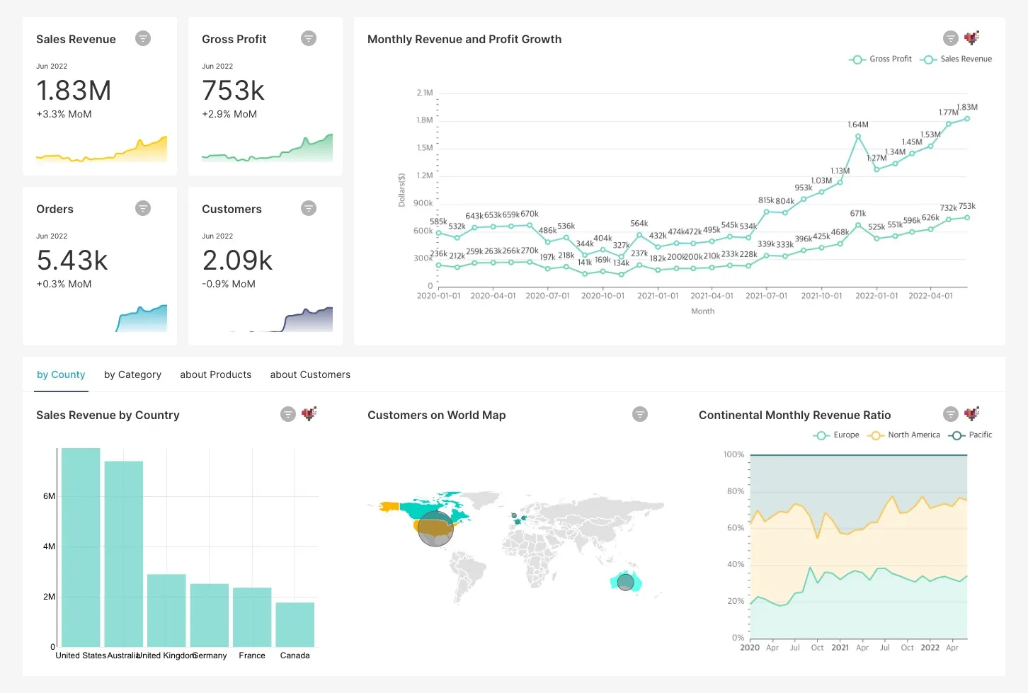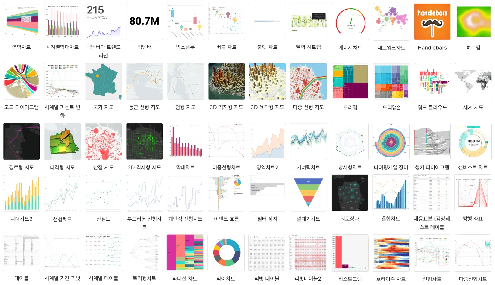 간단한 라인차트, 막대차트, 파이차트부터 맵차트, KPI 차트,