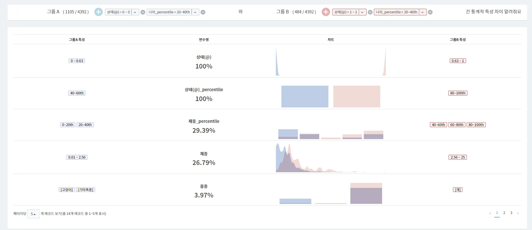 나이 상위 20~40%(더 어린) 동물을 비교했을 때 입양된 케이스는 체중이 20% 이내인 경우가 가장 많았고, 전체의 46.25% 비중을 차지했다.