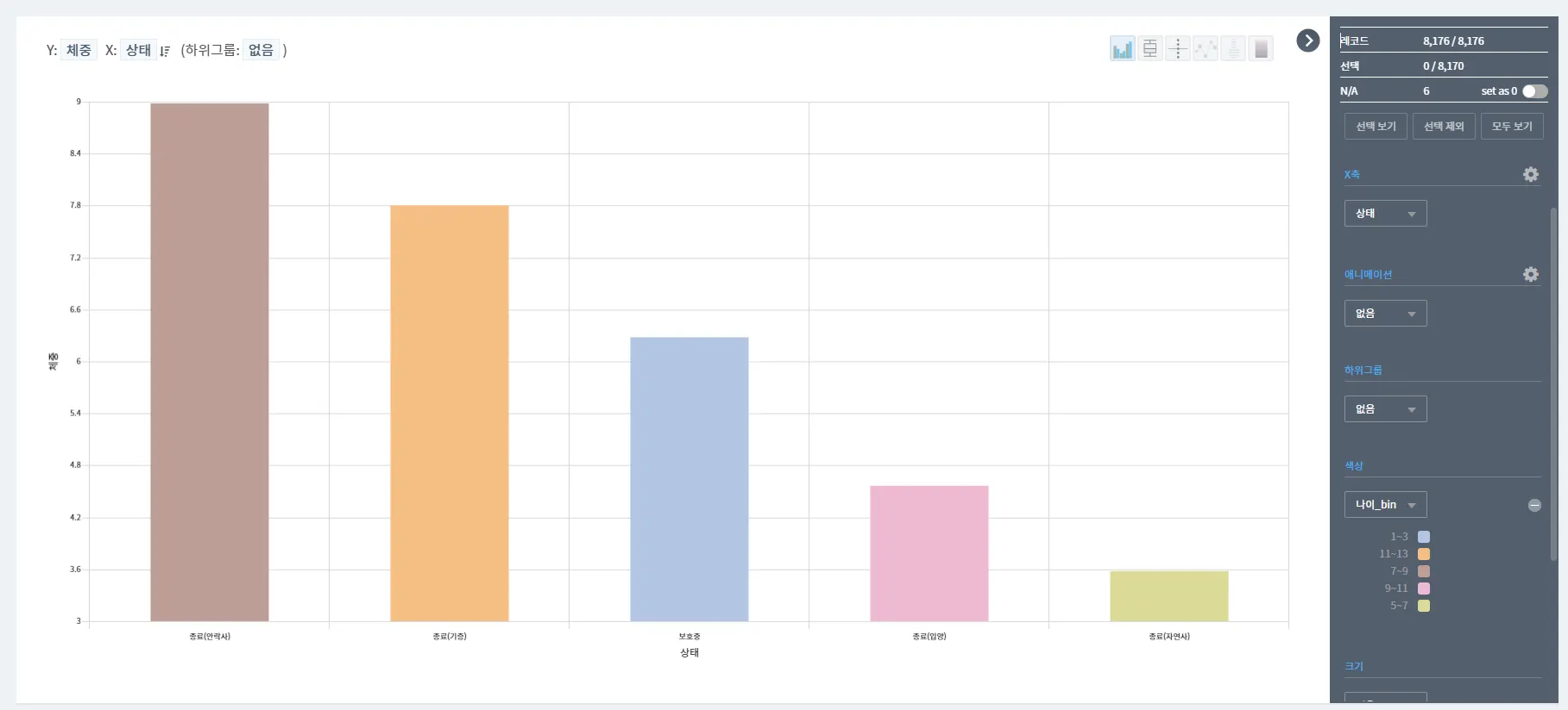 상태별 평균 체중을 확인했을 때 안락사한 동물의 평균 무게는 8.97kg으로 입양된 동물(4.56kg)보다 4.41kg 더 무거웠다.