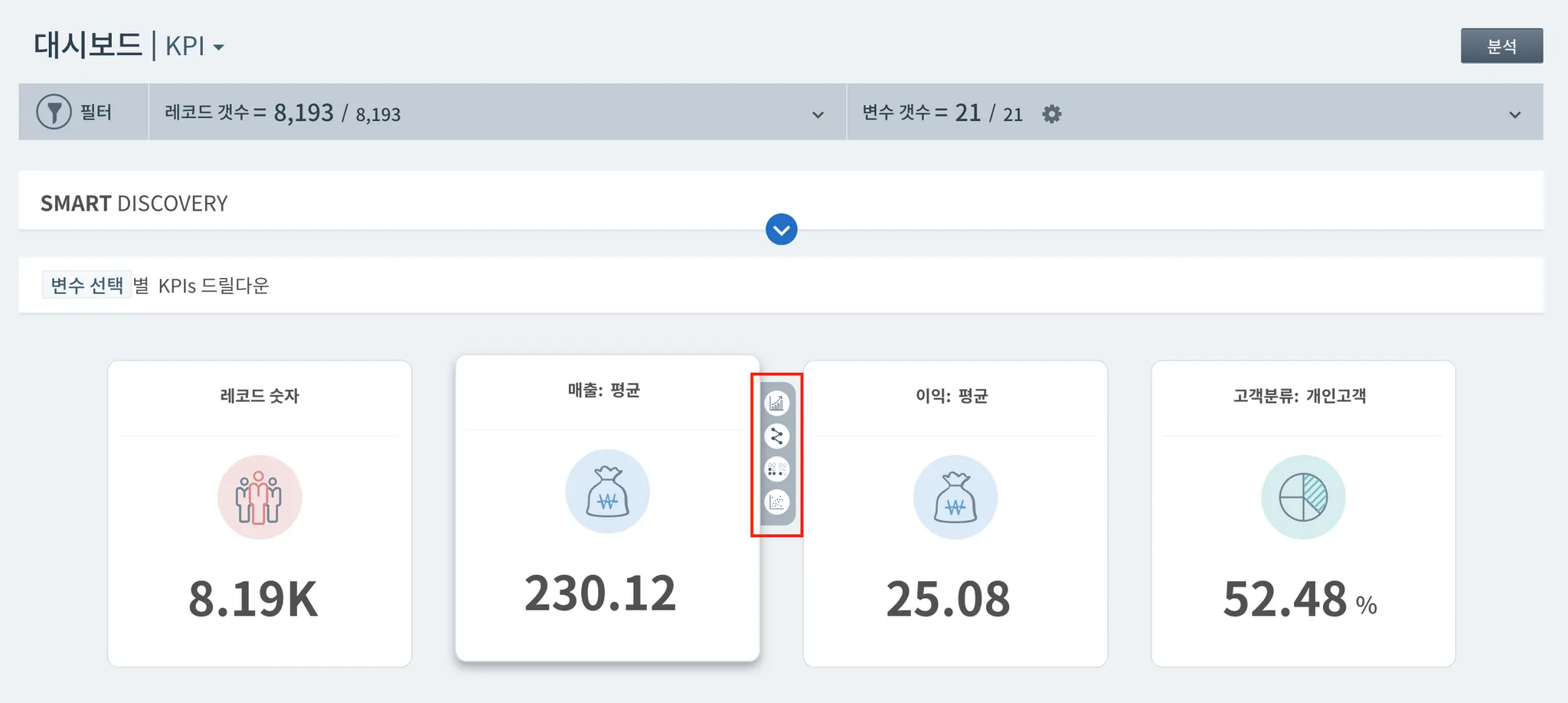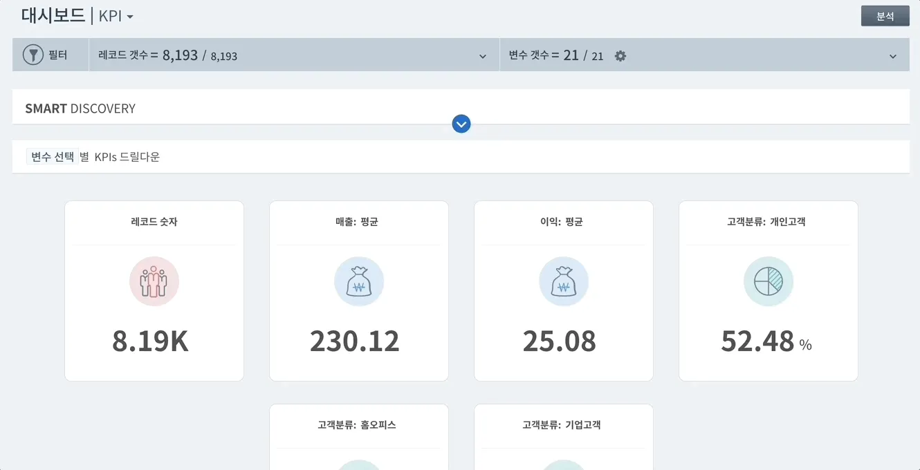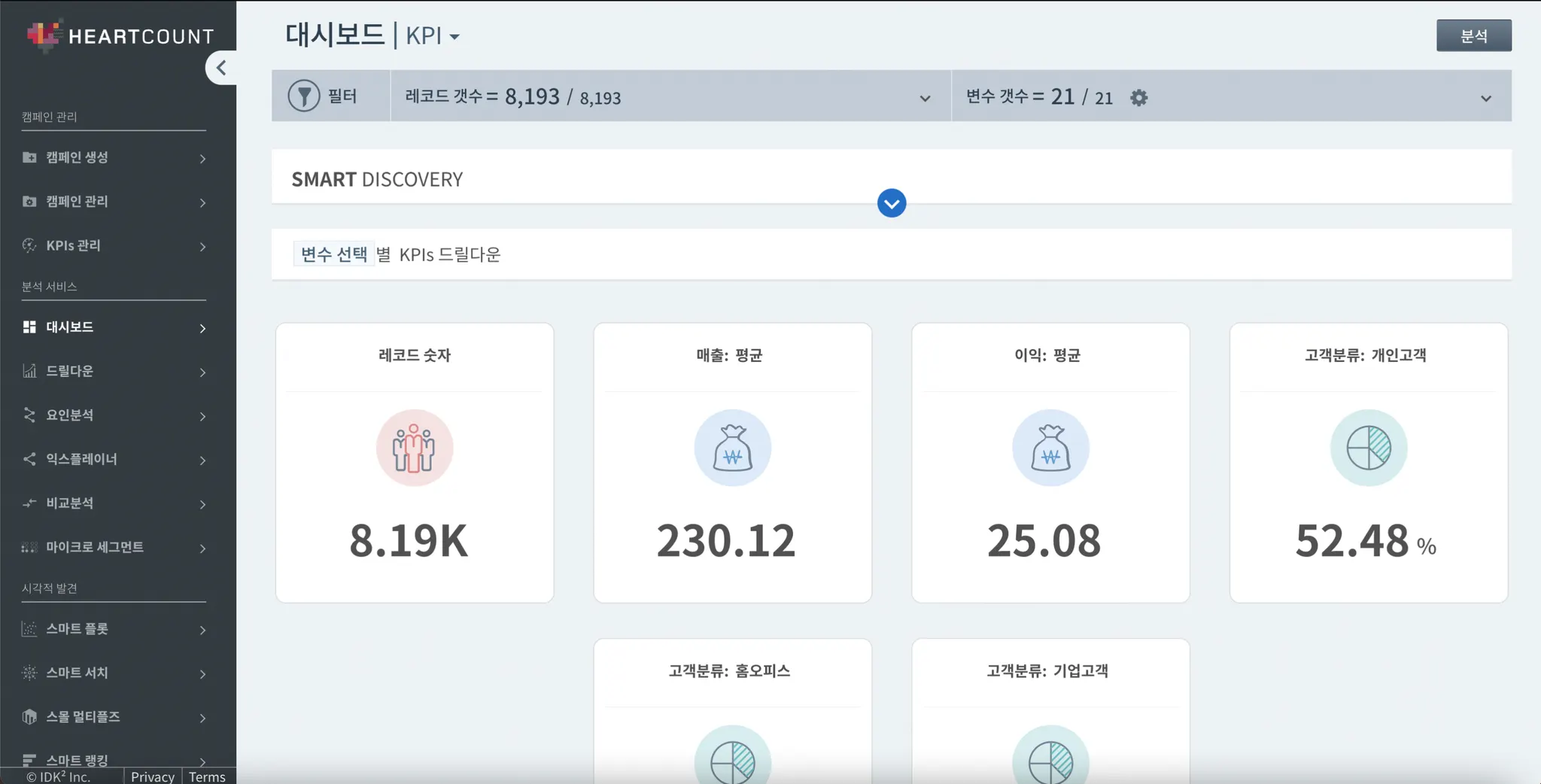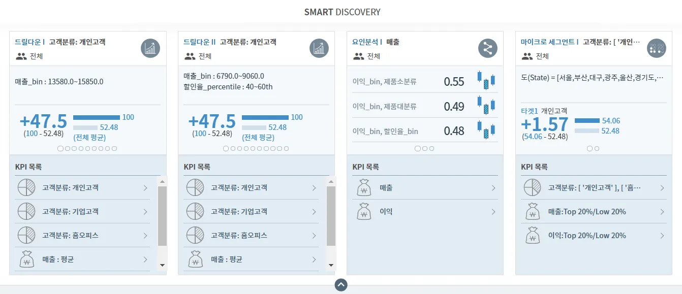 드릴다운, 요인분석, 마이크로 세그먼트 등 하트카운트의 모든 기능에 적용된 KPI의 전반적인 패턴 및 괄목할만한 결과를 한번에 보여줍니다.