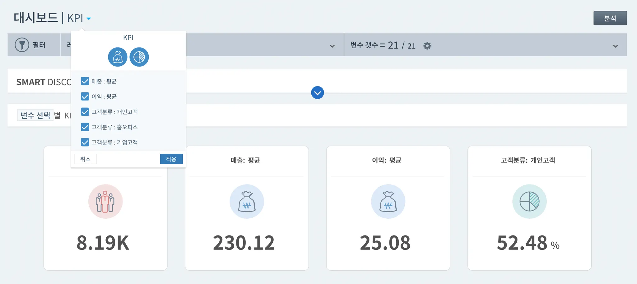 대시보드 우측 KPI의 ▼ 버튼을 클릭하면 설정한 KPI 항목들이 나타납니다. 각 항목을 선택하거나 일괄 선택하여 적용을 누르면 선택된 변수들이 대시보드 화면에 적용됩니다. 체크박스를 해제하여 해당 KPI를 대시보드에서 삭제할 수도 있습니다. 주의해야 할 것은 대시보드에서 삭제되는 것일 뿐 KPI에서 삭제되는 것은 아니라는 점입니다. :) KPI를 삭제 및 수정하고 싶을 때에는 KPIs 관리 메뉴를 이용해주세요.